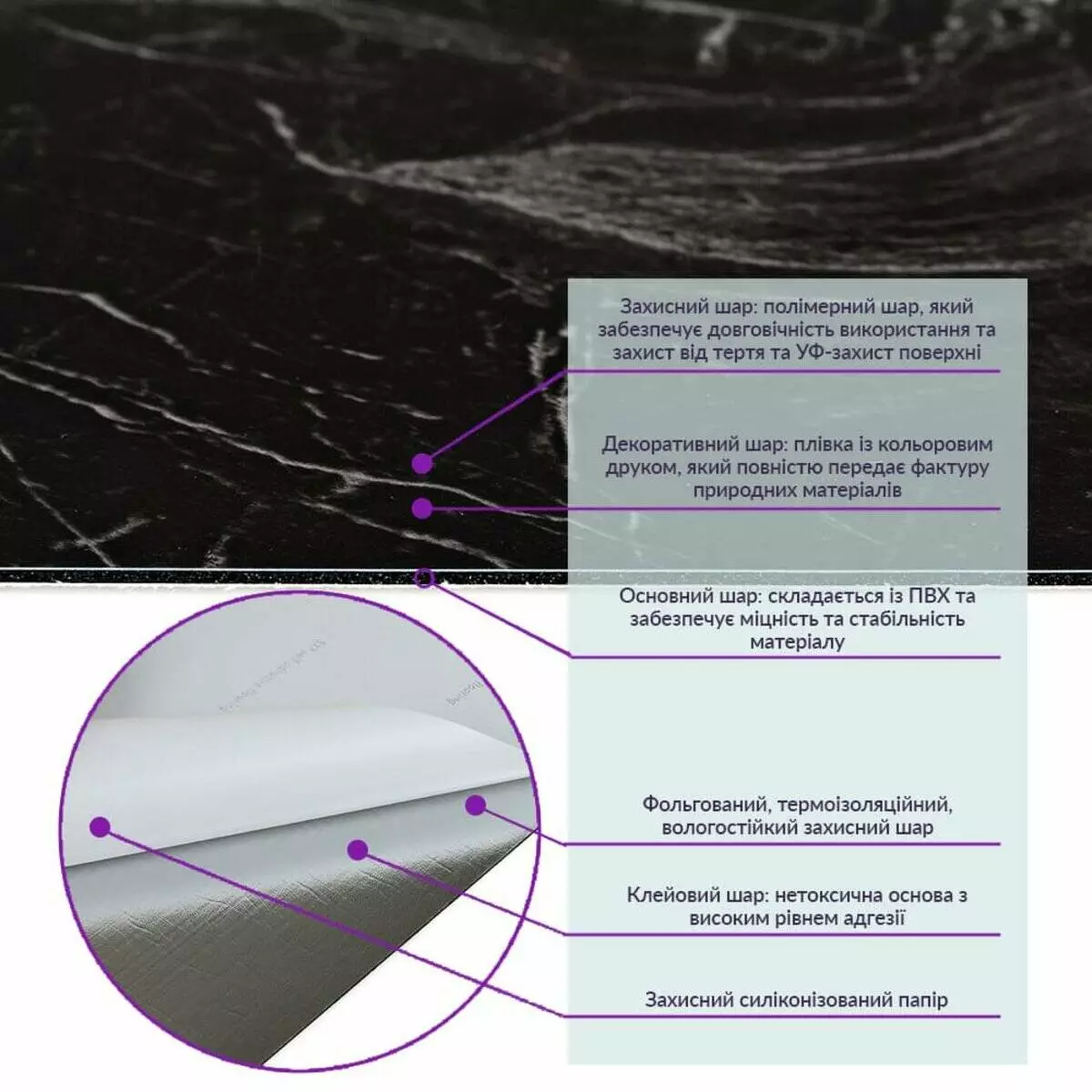 1. Полімерний шар: захищає від потертостей та дрібних механічних пошкоджень, забезпечує довговічність використання, а УФ захист допомагає запобігти вигоранню, зберігаючи колір насиченим.