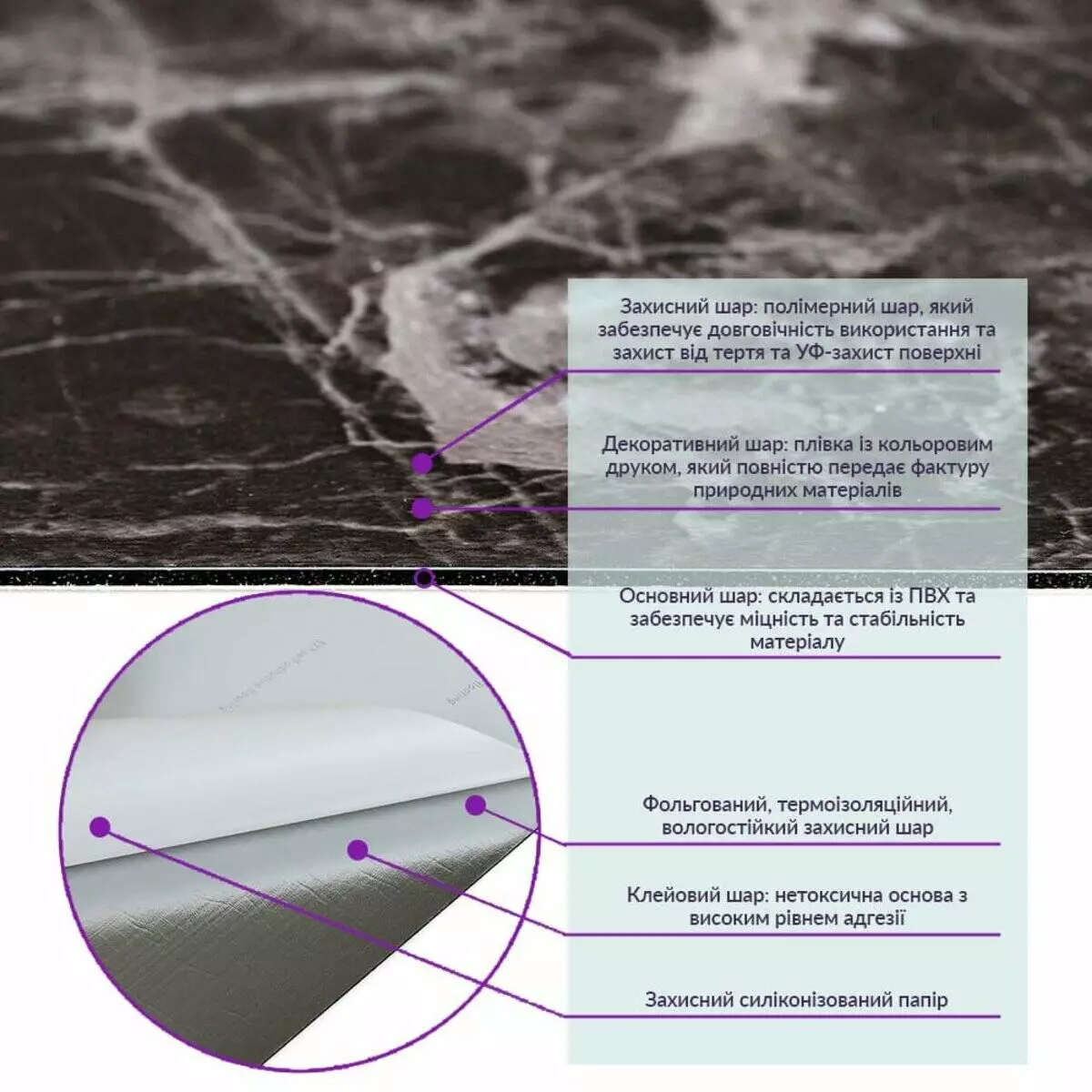 1. Полімерний шар: захищає від потертостей та дрібних механічних пошкоджень, забезпечує довговічність використання, а УФ захист допомагає запобігти вигоранню, зберігаючи колір насиченим.