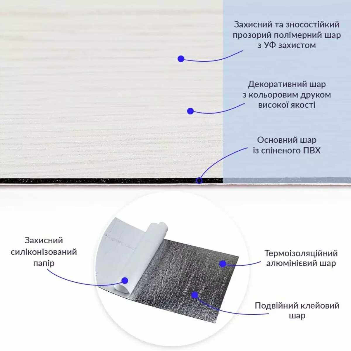 • Фольгований шар: основна властивість цього шару – відображення теплових хвиль, що дозволяє мінімізувати теплові втрати, тим самим покращити теплоізоляцію приміщення.