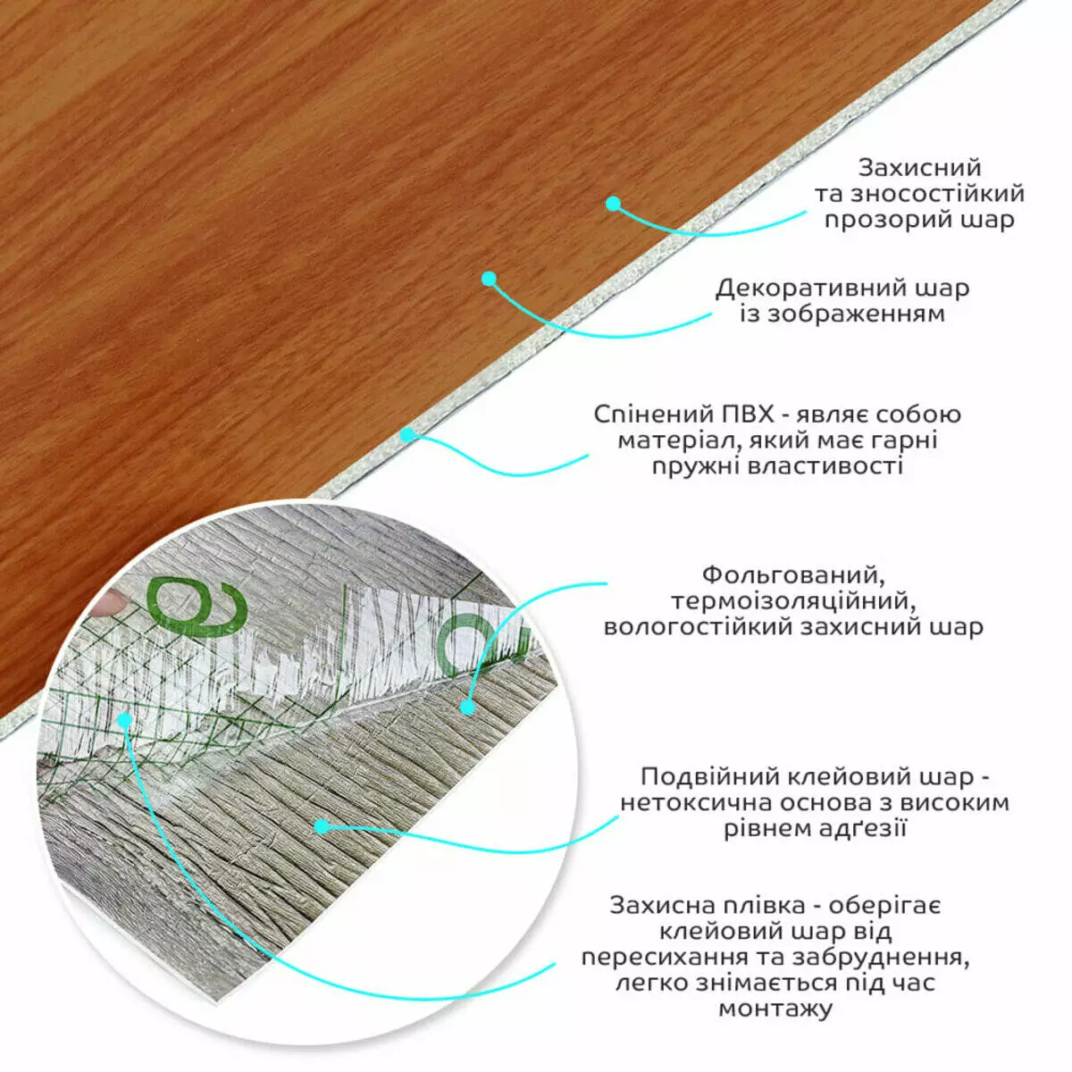 • Декоративний шар: плівка з кольоровим друком високої роздільної здатності, яка повністю імітує фактуру природних матеріалів завдяки чіткому та детальному зображенню.