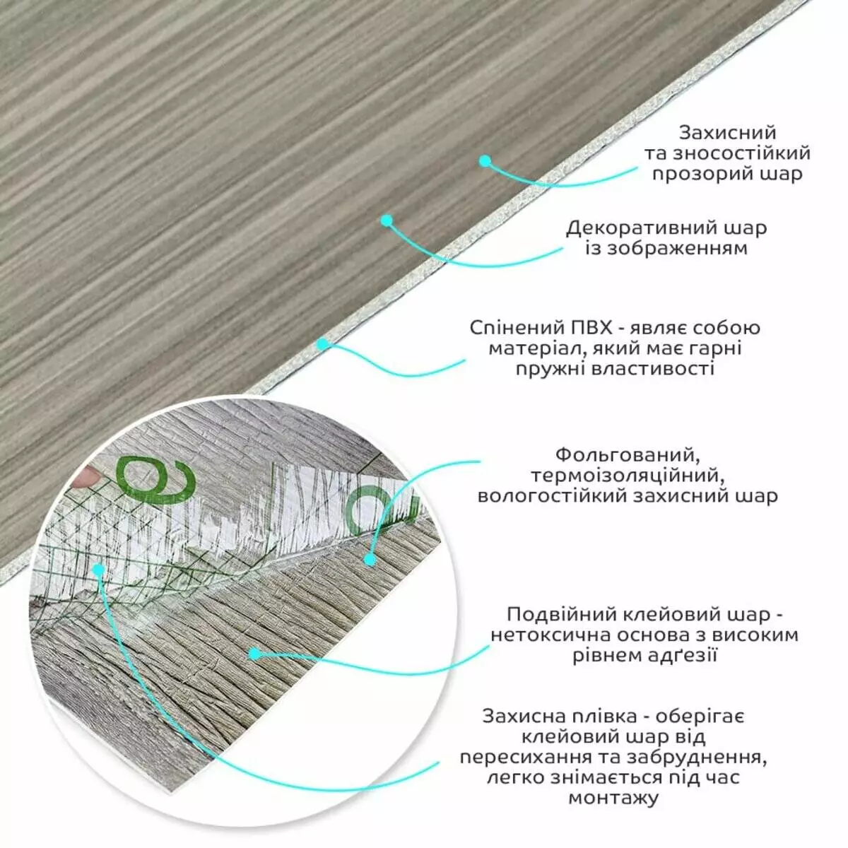 • Декоративний шар: плівка з кольоровим друком високої роздільної здатності, яка повністю імітує фактуру природних матеріалів завдяки чіткому та детальному зображенню.