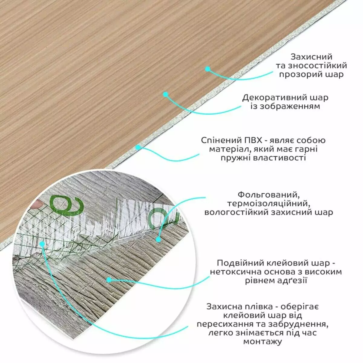 • Декоративний шар: плівка з кольоровим друком високої роздільної здатності, яка повністю імітує фактуру природних матеріалів завдяки чіткому та детальному зображенню.