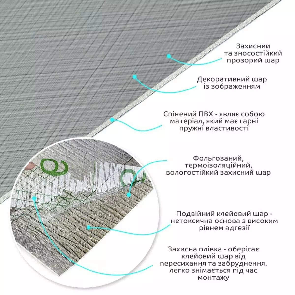 • Декоративний шар: плівка з кольоровим друком високої роздільної здатності, яка повністю імітує фактуру природних матеріалів завдяки чіткому та детальному зображенню.