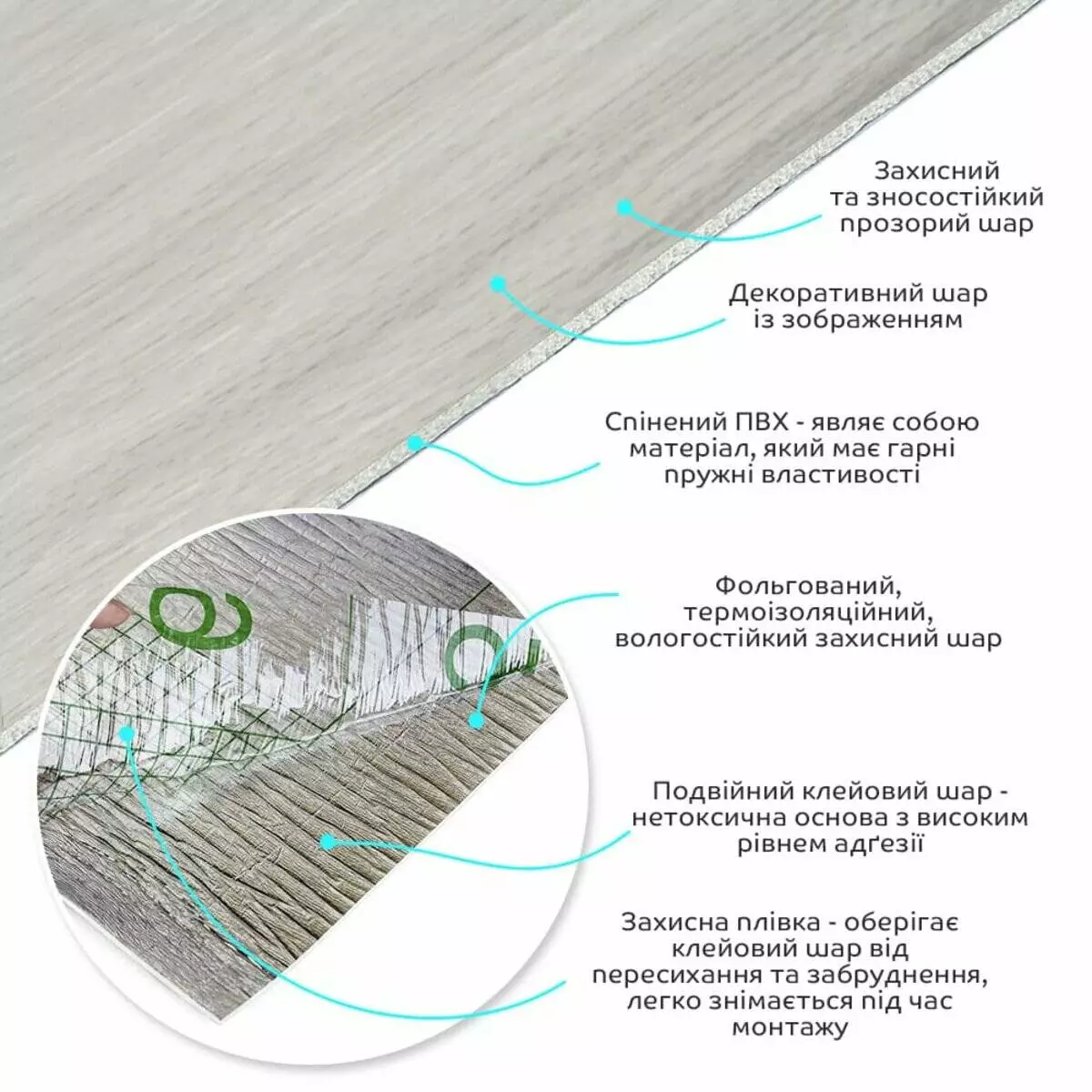 • Декоративний шар: плівка з кольоровим друком високої роздільної здатності, яка повністю імітує фактуру природних матеріалів завдяки чіткому та детальному зображенню.