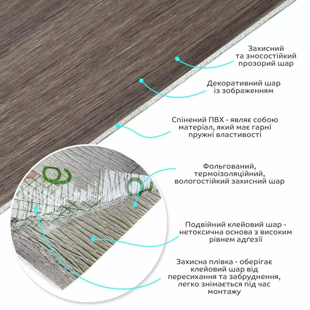 • Декоративний шар: плівка з кольоровим друком високої роздільної здатності, яка повністю імітує фактуру природних матеріалів завдяки чіткому та детальному зображенню.