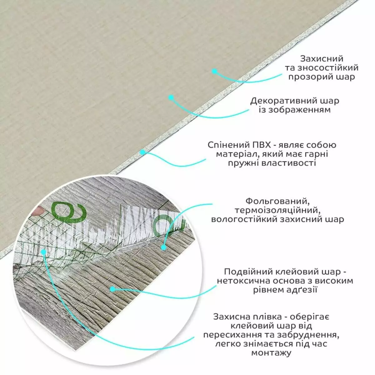 • Декоративний шар: плівка з кольоровим друком високої роздільної здатності, яка повністю імітує фактуру природних матеріалів завдяки чіткому та детальному зображенню.