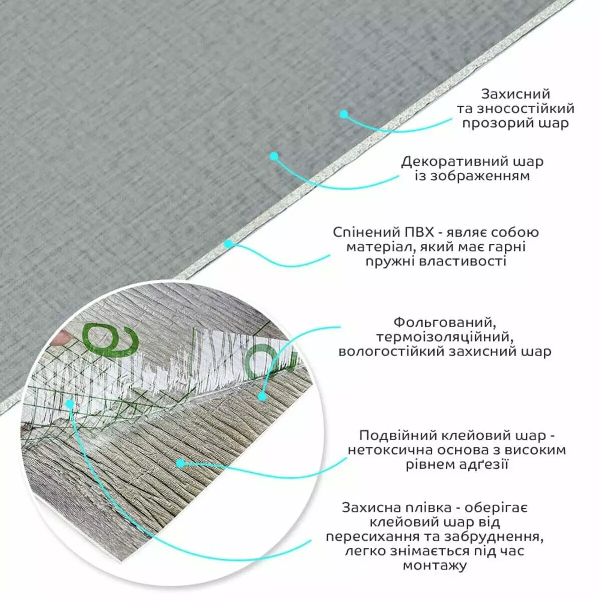 • Декоративний шар: плівка з кольоровим друком високої роздільної здатності, яка повністю імітує фактуру природних матеріалів завдяки чіткому та детальному зображенню.