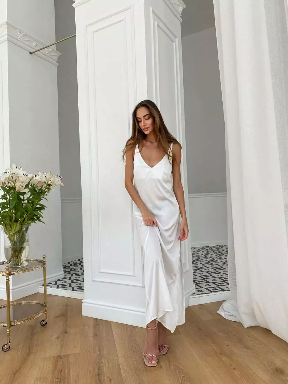 Модель поєднує ніжність шовку та вишуканий V-подібний виріз, та регульовані бретелі підкреслюють жіночність