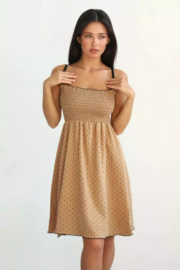 Ніжний відтінок з контрастним чорним горошком додає сарафану елегантного вигляду та легкого ретро-шарму. Горошок — це вічний принт, який надає образу грайливості та витонченості, а в поєднанні з м'яким коричневим кольором цей дизайн виглядає сучасно та стильно. Такий відтінок є універсальним і підходить для будь-якого типу зовнішності, додаючи образу ніжності й водночас роблячи його яскравим та привабливим.