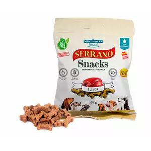 SERRANO снеки для собак 100g, ливер SERRANO от MEDITERRANEAN NATURAL - это 100% натуральные лакомства для собак, изготовленные из мяса высокого качества. Содержат масло орегано и розмарин, природные антиоксиданты, которые улучшают пищеварение. Гипоаллергенны, не содержат глютена, искусственных красителей, ГМО, трансжирных кислот. Состав Мясо 70% (мин. 10% мяса свиной печени), рис, растительный глицерин. Добавки: Консерванты: пропионовая кислота, формиат кальция, лимонная кислота. Пищевые добавки: масло орегано. Аналитические составляющие: Белок: 25,8%, сырой жир: 7,6%, сырая зола: 11%, клетчатка: 2%, влага: 20,1%, 306 ккал/100 г, кальций: 2,7%, фосфор: 1,3%, омега-6: 0,85 г/100 г. , омега-9: 1,46 г/100 г