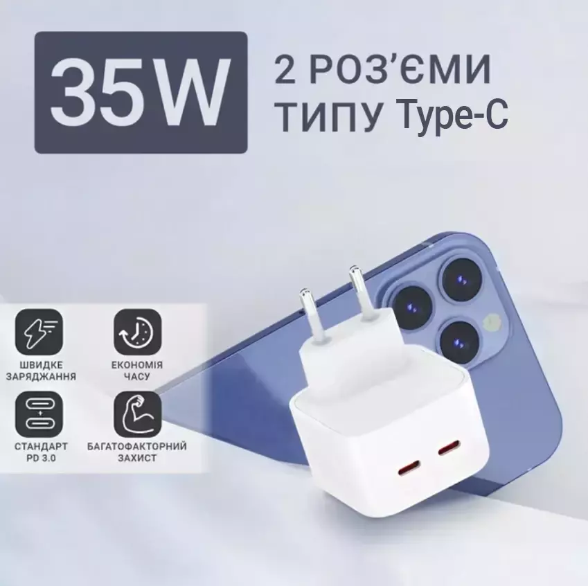 Сетевое зарядное устройство для Apple 35W с двумя портами USB-C - это надежное и мощное решение, которое дарит тебе комфорт и уверенность в зарядке твоих устройств Apple. Получи полный контроль над энергией своих устройств с этим компактным и мощным зарядным устройством.