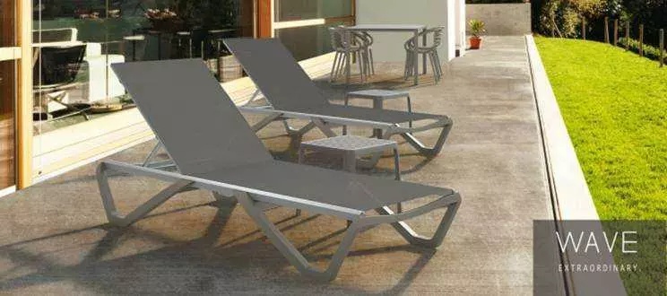 Шезлонг Wave незамінний при відпочинку на дачі, у моря або біля басейну. Інноваційне покриття з високоміцної сітчастої тканини від провідного французького виробника Serge Ferrari приємно на дотик і надійно в експлуатації. Покриття виготовлено з повітропроникною «дихаючої» тканини. Воно не розтягується і не дає усадку, не боїться вологи, швидко сохне, не вигоряє на сонці і залишається прохолодним на дотик навіть під палючими променями сонця. Покриття володіє антибактеріальними властивостями, в його склад входять натуральні екологічні компоненти. Рама виготовлена з анодованого алюмінію: для матеріалу характерний натуральний металевий блиск, що надає виробу елегантність і респектабельність. Конструкція шезлонга міцна, ергономічна і стійка. Для зручності переміщення модель оснащена коліщатками, допустиме навантаження до 200 кг. Спинку можна регулювати за допомогою розташованих на зворотному боці шезлонга пазів: вона приймає п'ять положень. Виріб стійкий до впливу вологи, УФ-випромінювання, перепадів температур, корозії. Штабелюються до 20 штук.