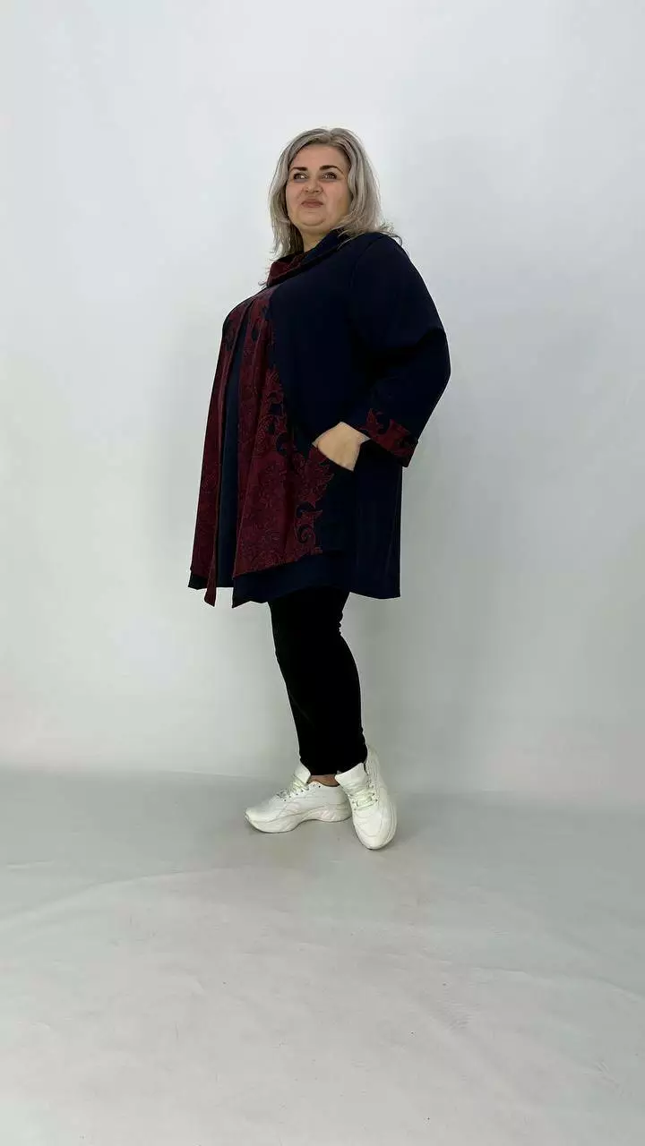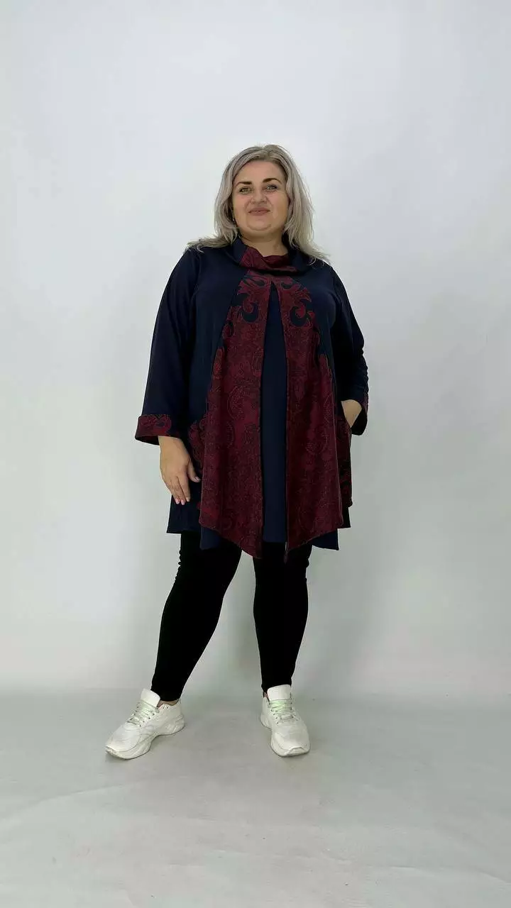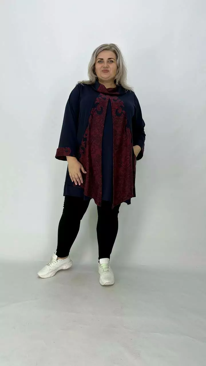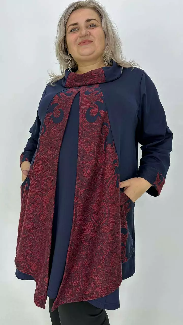 Шикарна туніка-імітація двійки з французького трикотажу виробництва Корея, щільність середня, розтяжність хороша, не мнеться, приємна до тіла. Силует Трапеція, комір хомут, рукав з манжетом довжина 5/6, з кишенями.