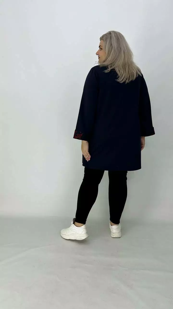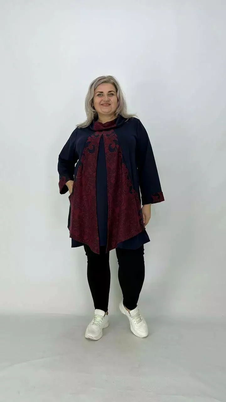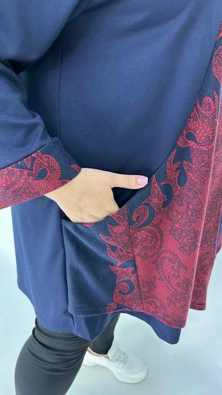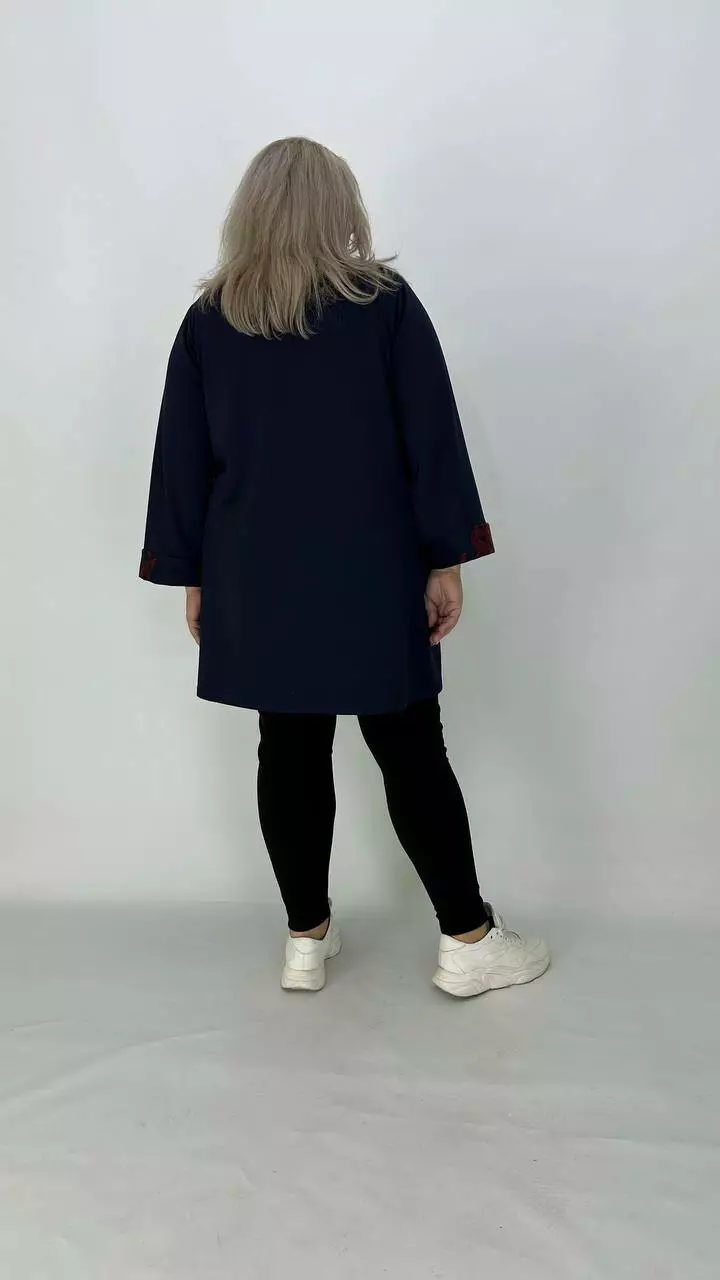 Шикарна туніка-імітація двійки з французького трикотажу виробництва Корея, щільність середня, розтяжність хороша, не мнеться, приємна до тіла. Силует Трапеція, комір хомут, рукав з манжетом довжина 5/6, з кишенями.