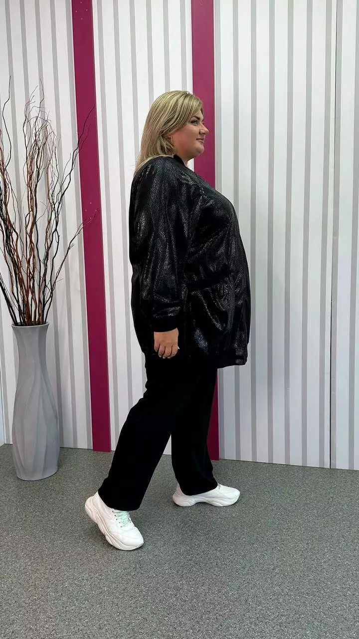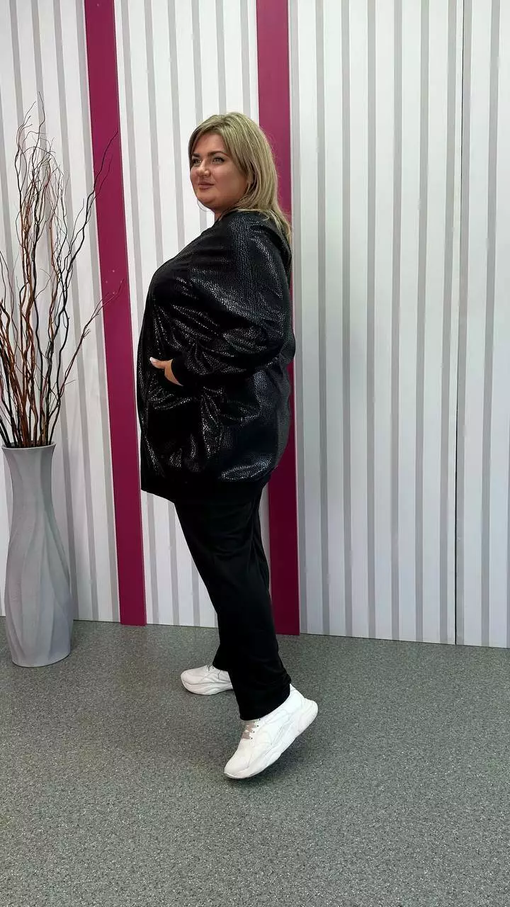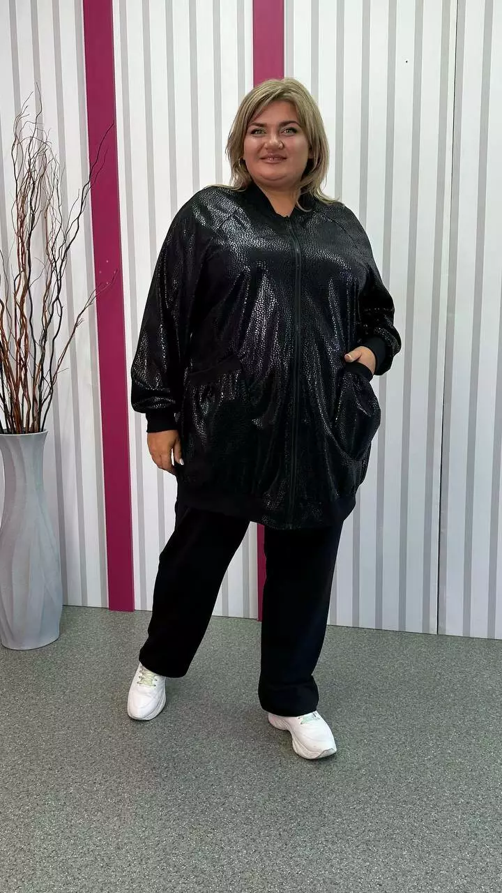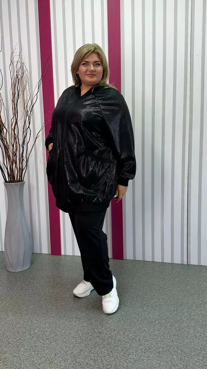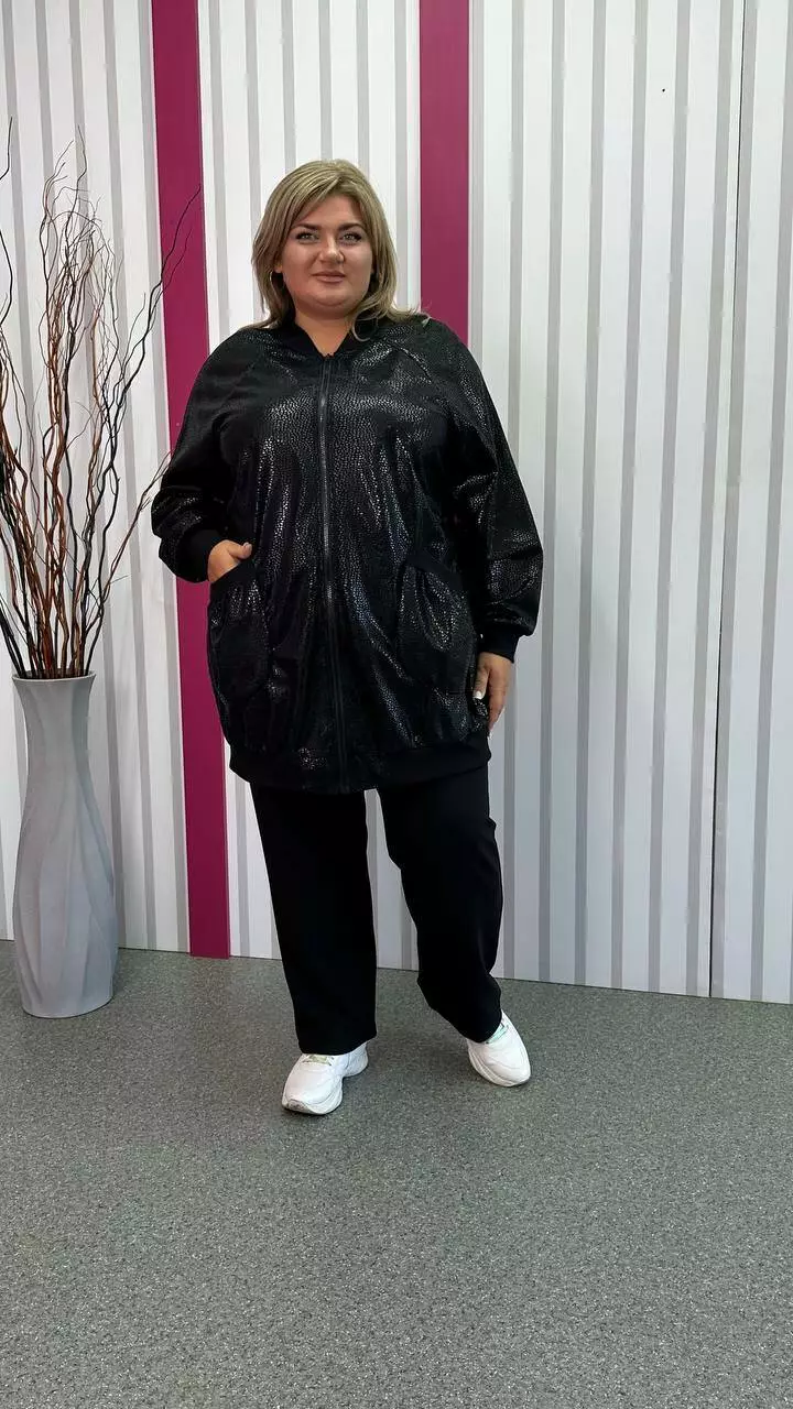 Тканина м'яка, приємна на дотик, без розтяжності, якість супер. Силует-трапеція, по низу пояс із трикотажної гумки створює ефект барила. Без підкладки, ¦рукав-реглан, кишені об'ємні, накладні.