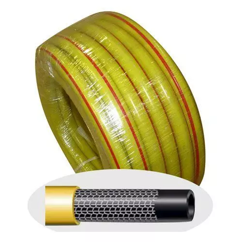 Трехслойный садовый шланг для общего применения. Внешний слой непрозрачного желтого цвета с оранжевой полосой, плетеное текстильное армирование, внутренний черный слой предотвращает образование водорослей.Армированный.