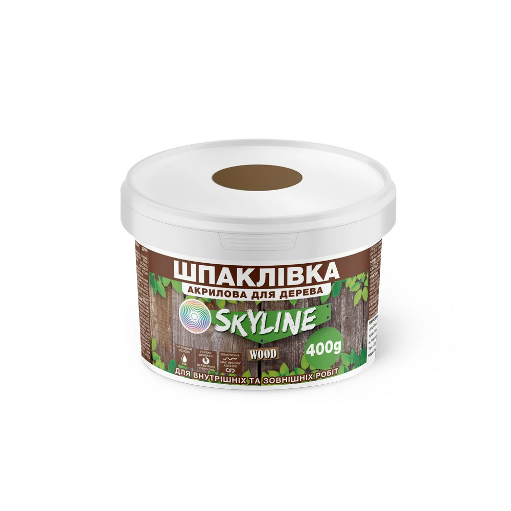 Шпаклевка для дерева акриловая для внутренних и наружных работ SkyLine Wood (Скайлайн Вуд). Водоразбавляемая. Готовая к применению. Эластичная, с высокой адгезией к разным типам основ. Быстро сохнет, легко шлифуется, заполняет поры. Устраняет дефекты любых деревянных поверхностей. Не содержит органических растворителей. Уменьшает расход лакокрасочных материалов, которые наносятся после шпаклевания. Имитирует оттенки дерева. Без запаха.