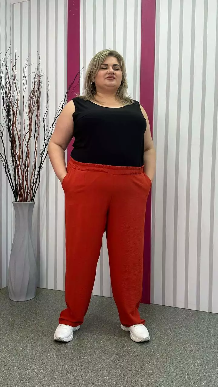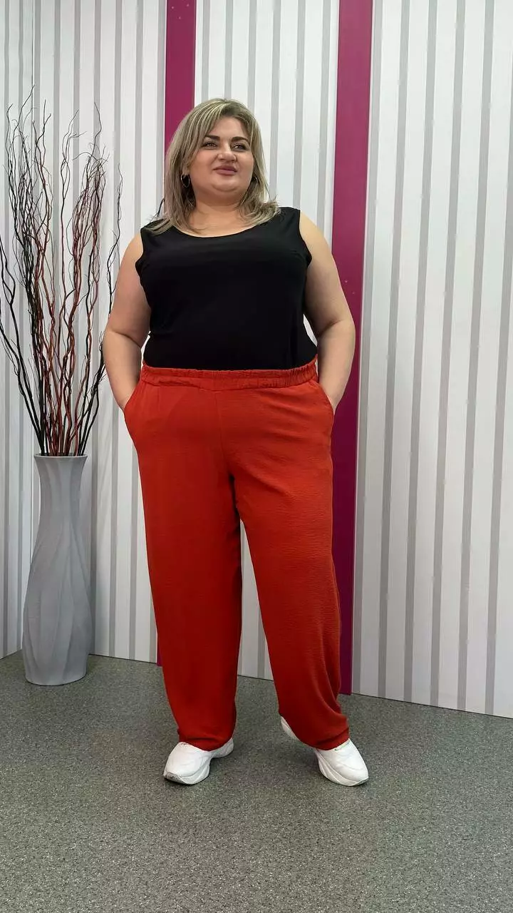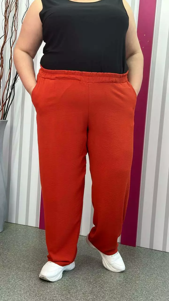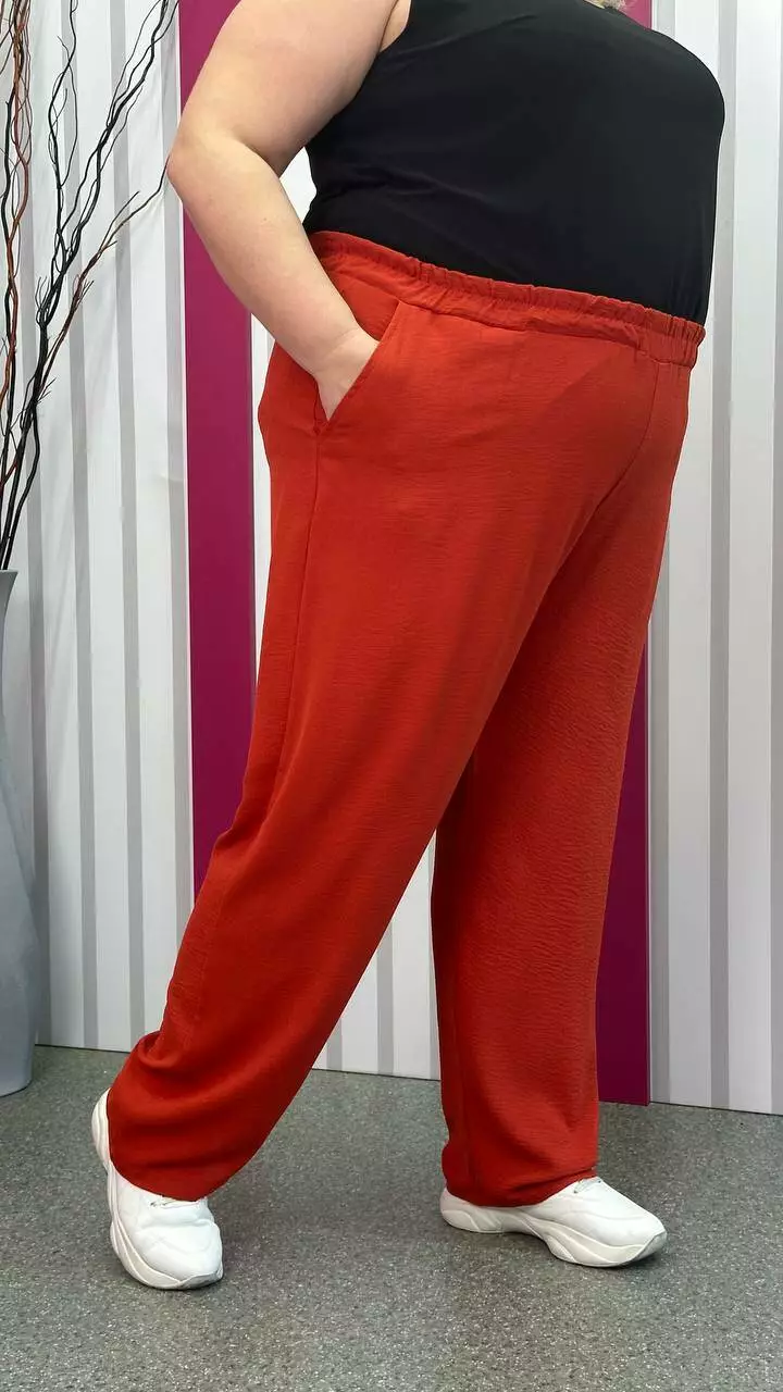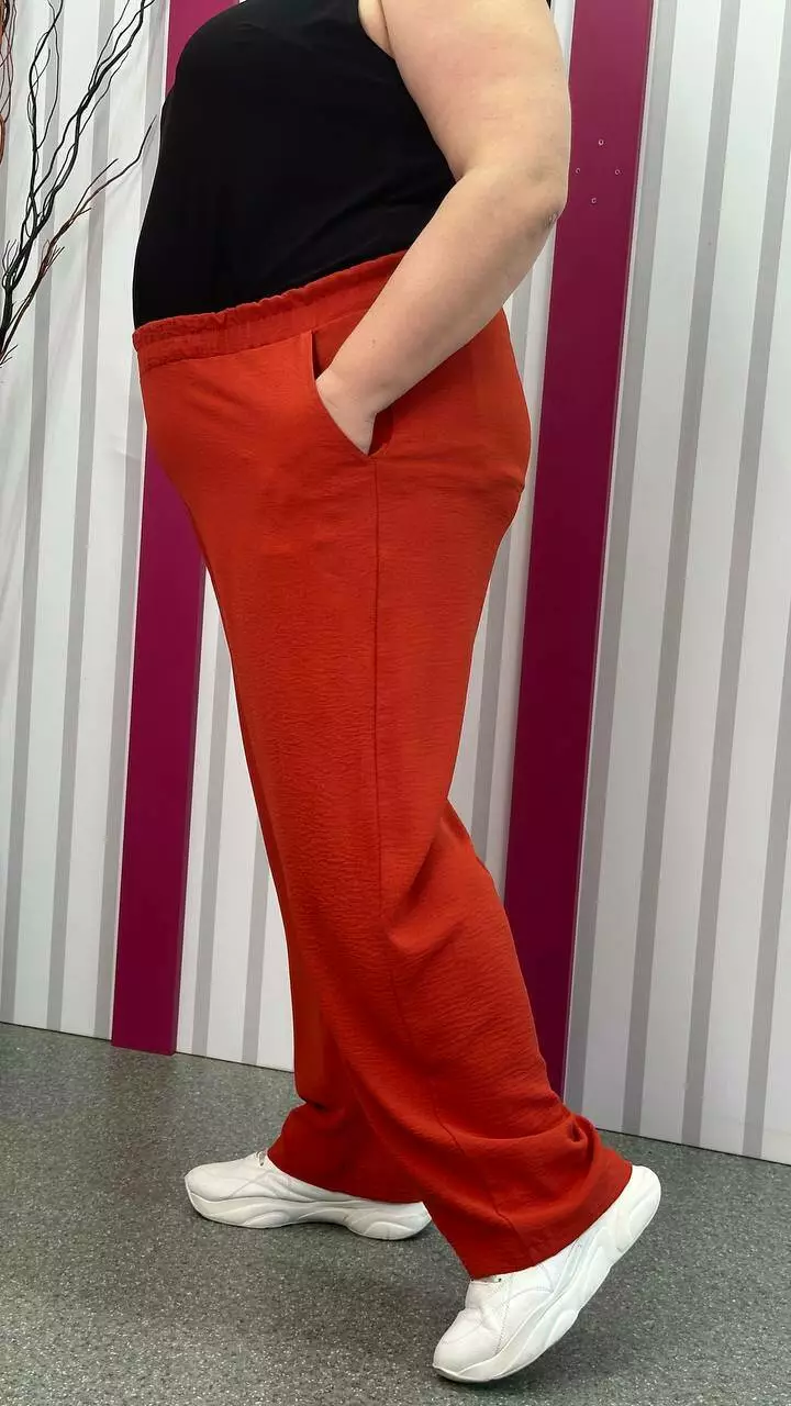 невеликою розтяжністю. Пояс на гумці, з кишенями, висока посадка.