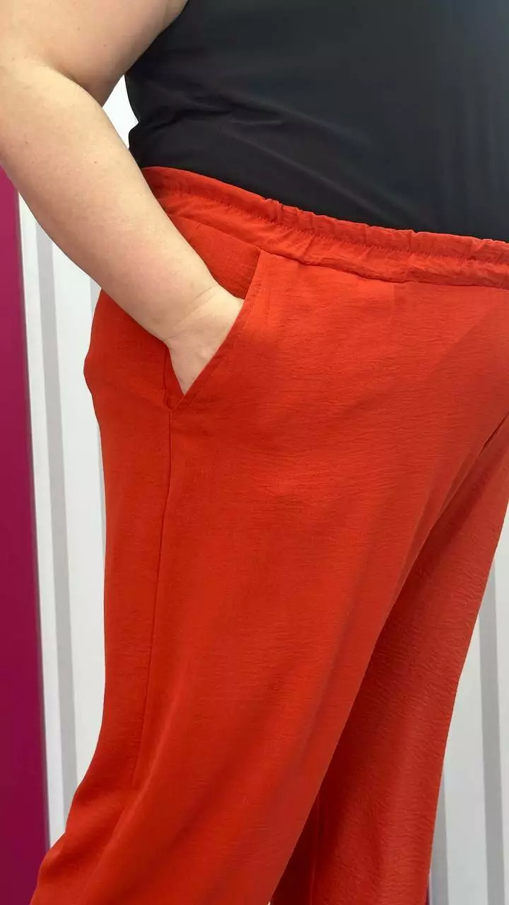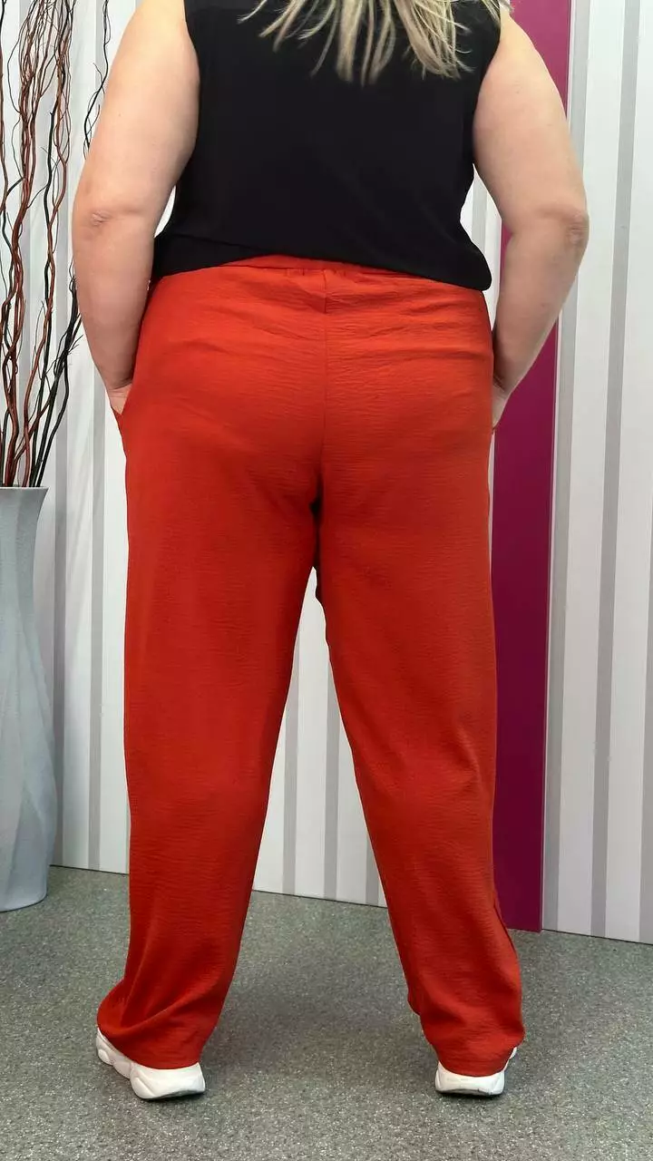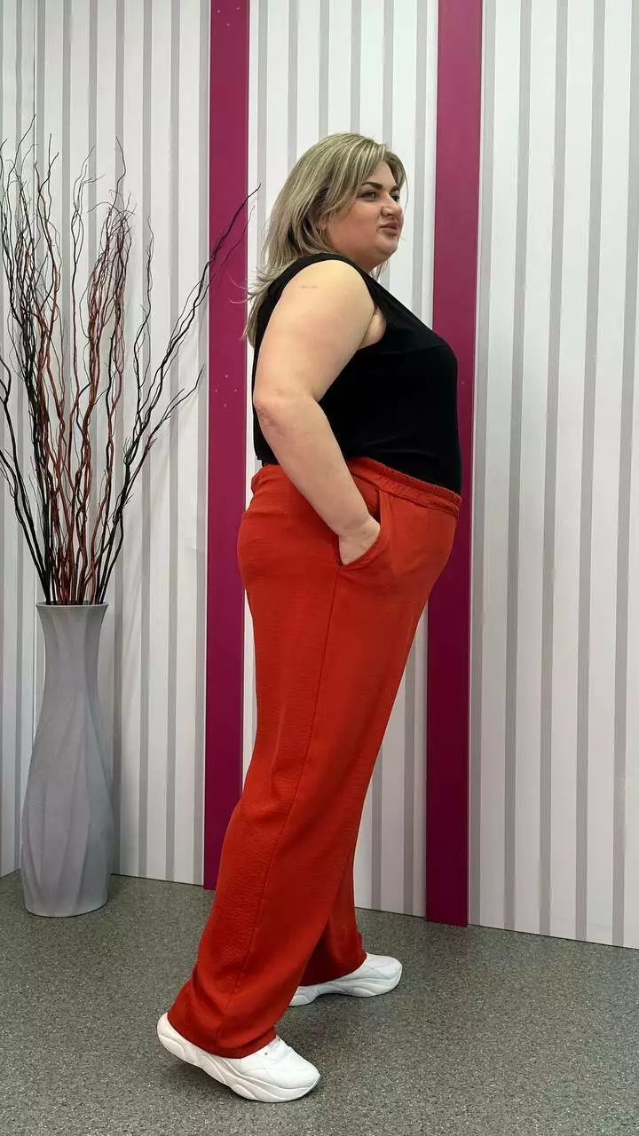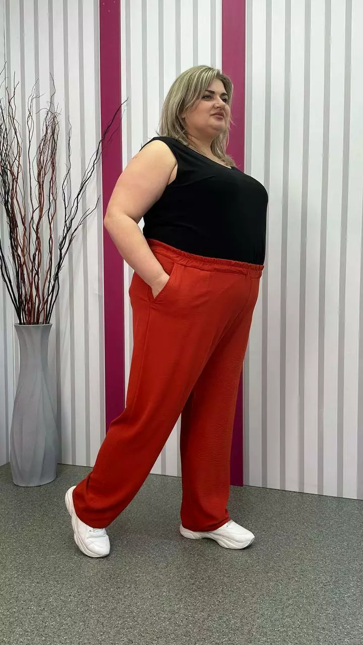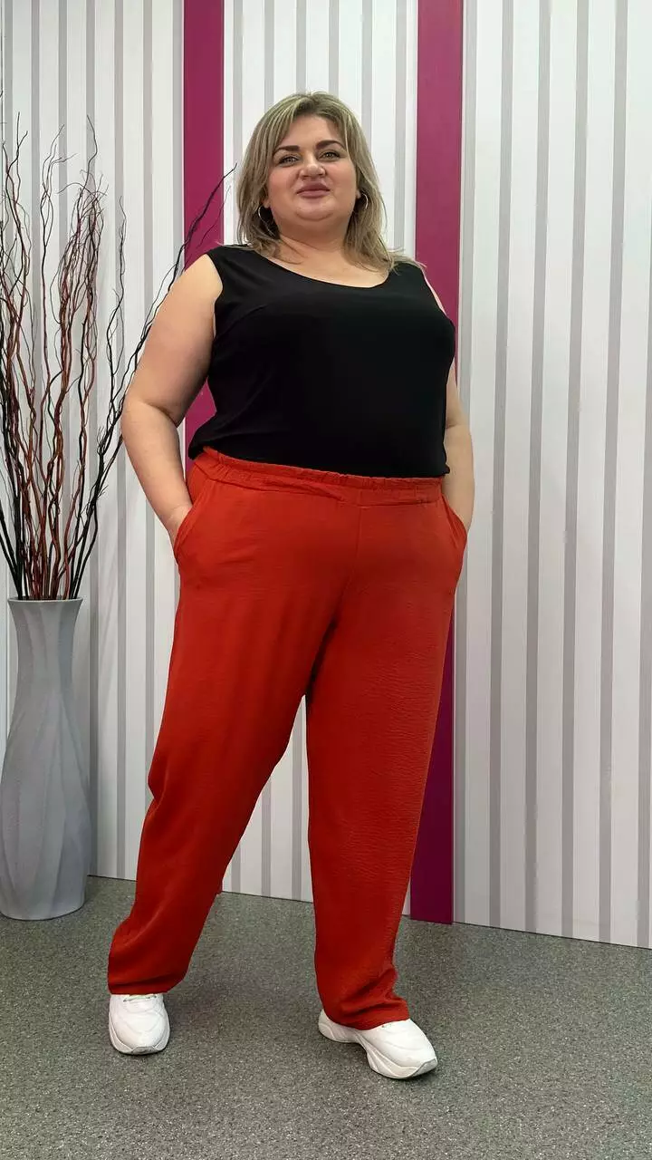 невеликою розтяжністю. Пояс на гумці, з кишенями, висока посадка.