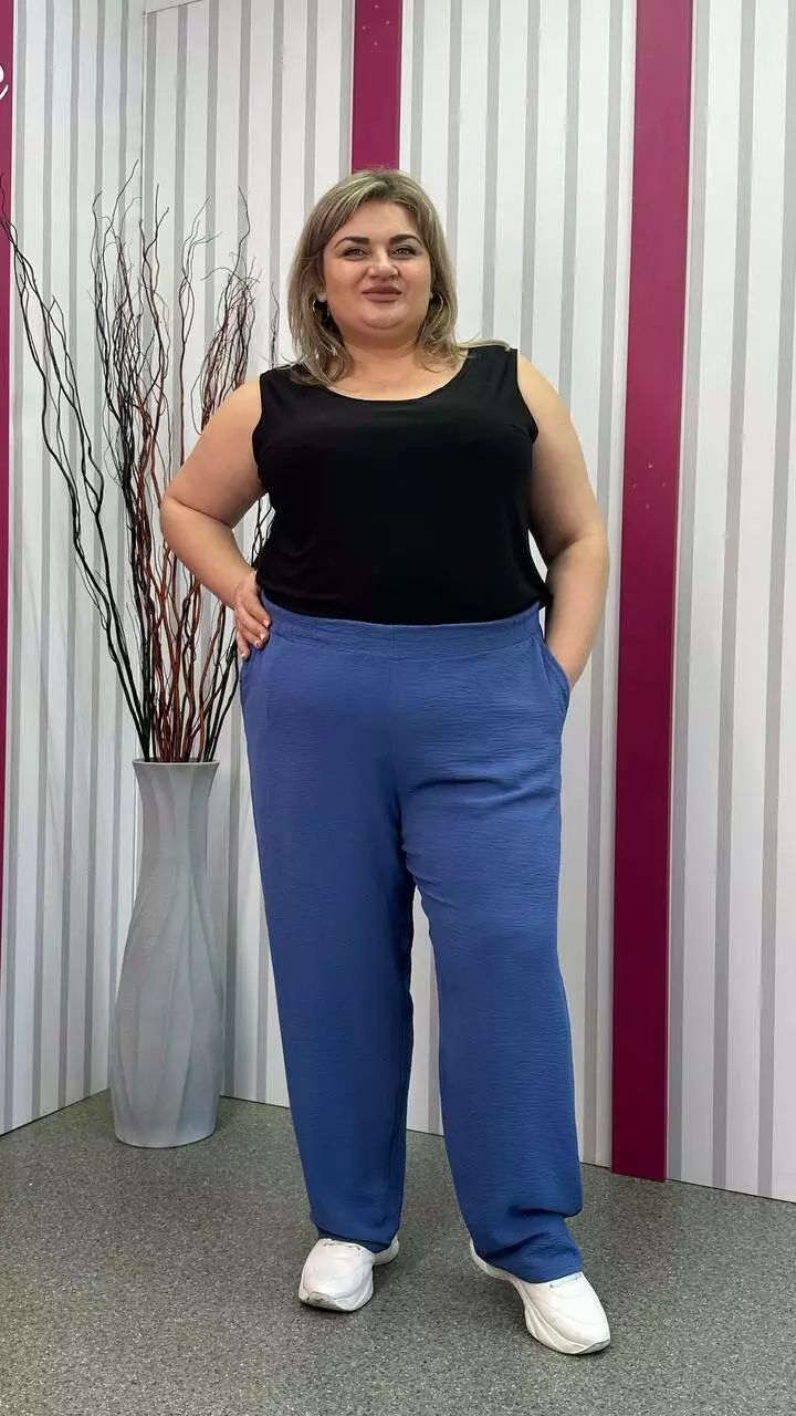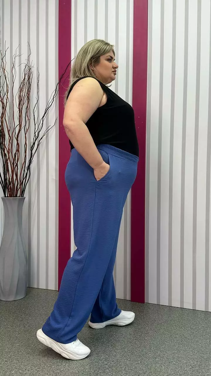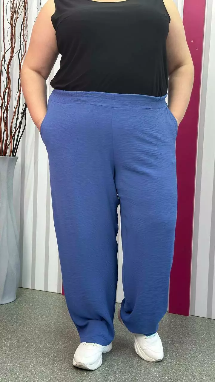 невеликою розтяжністю. Пояс на гумці, з кишенями, висока посадка.