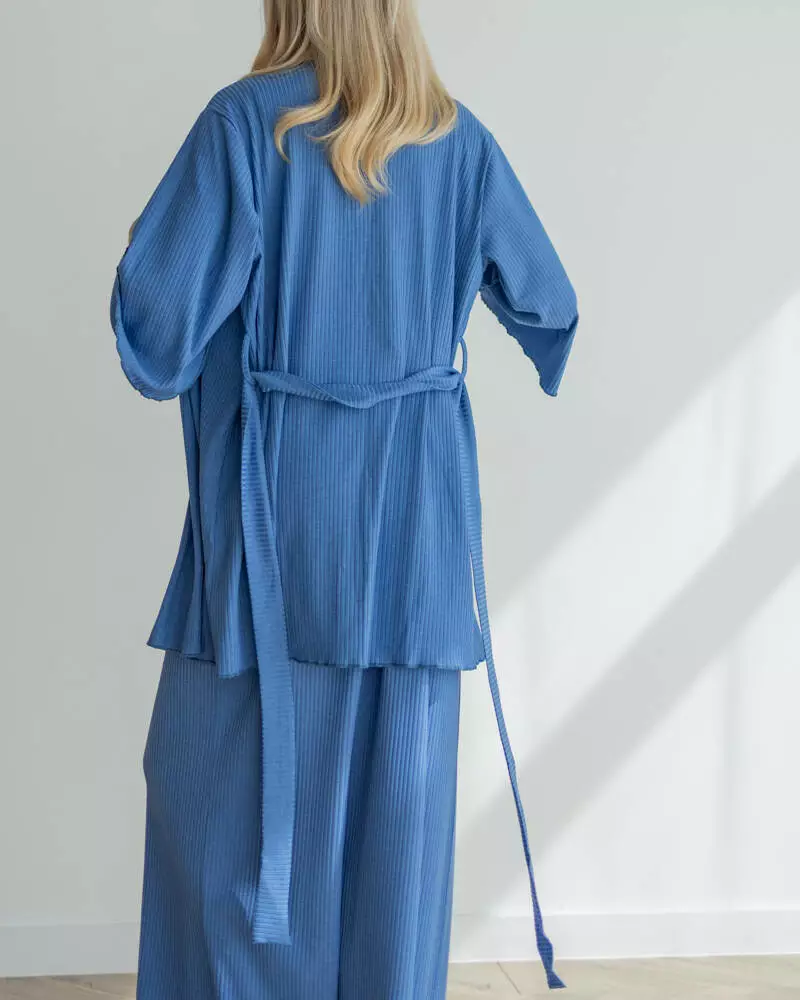 Довгі вільні штани на мякій резинці із приємного матеріалу трикотаж рубчик. Модель дуже зручна, завдяки фасону не сковує рухів та зберігає Ваш комфорт. Штани чудово поєднуються із піжамним комплектом-трійкою "Dana".