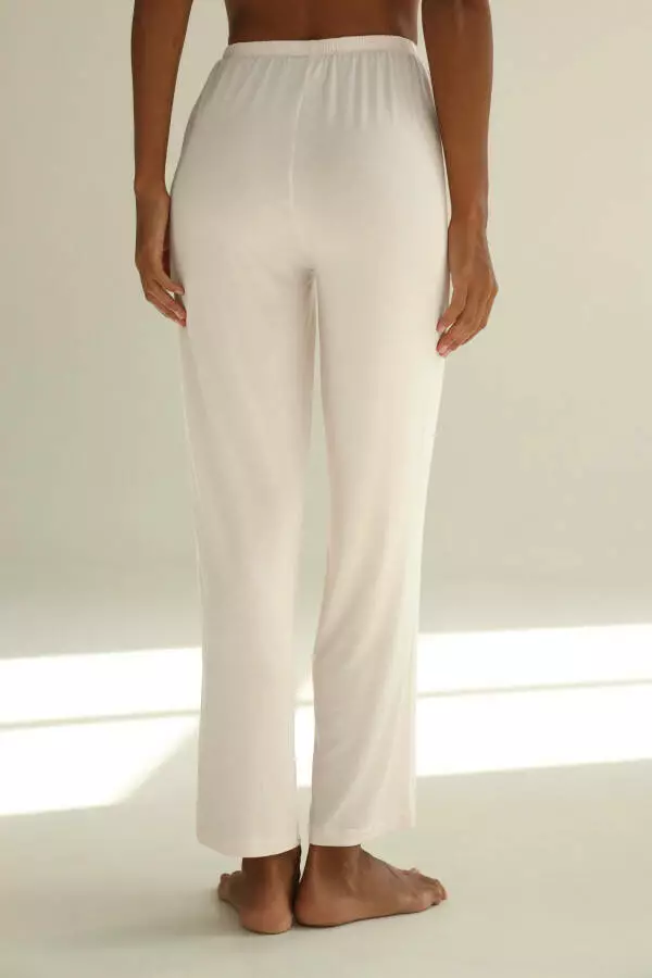 Кремовий колір надає штанам елегантності та робить їх ідеальними для створення затишної атмосфери в домашньому гардеробі. Цей теплий відтінок додає образу м’якості та гармонійно поєднується з іншими кольорами, дозволяючи легко комбінувати штани з піжамними топами, халатами або футболками. Кремовий колір асоціюється з природністю і теплом, що сприяє розслабленню та налаштовує на відпочинок. Він підходить для будь-якого типу шкіри, додаючи образу витонченості та підкреслюючи вашу природну красу.