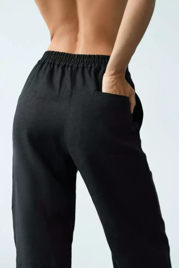 Чорний колір надає штанам універсальності та класичної елегантності. Він легко комбінується з іншими кольорами та стилями, що дозволяє створювати як повсякденні, так і більш формальні образи. Лляні штани в чорному кольорі можна поєднувати з блузами для елегантного вигляду, футболками чи топами для невимушеного стилю або навіть з піджаками, створюючи модний образ для ділових зустрічей. Чорний колір також є практичним вибором для тих, хто хоче мати в гардеробі базовий та універсальний елемент одягу, який завжди буде виглядати доречно.