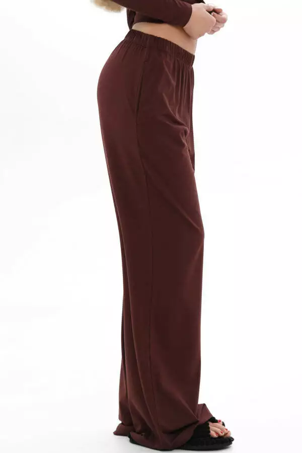 Комфортні штани у насиченому шоколадному відтінку – ідеальний баланс між стилем і зручністю. Вільний крій і м’яка тканина роблять їх чудовим вибором для повсякденного носіння. Поєднуються як із лонгслівом з колекції, так і з іншими елементами гардеробу