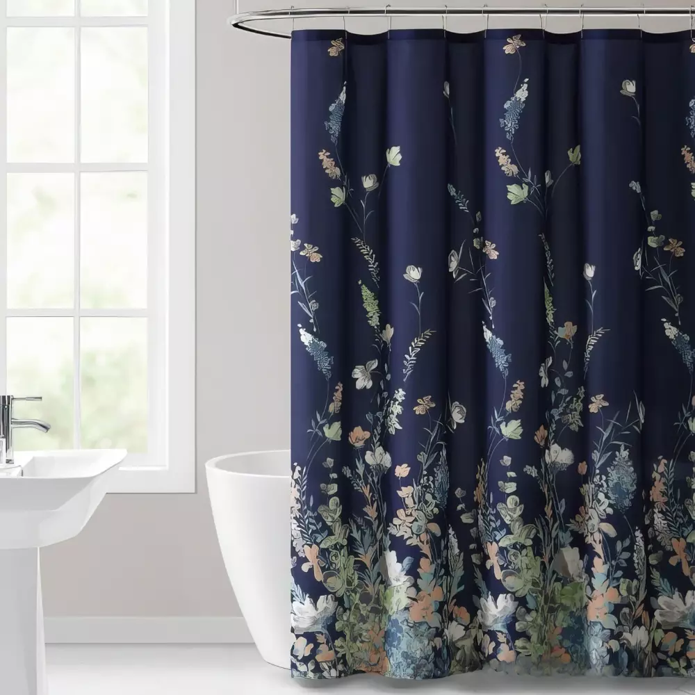 Ця стильна штора для ванної кімнати прикрашена вишуканим квітковим