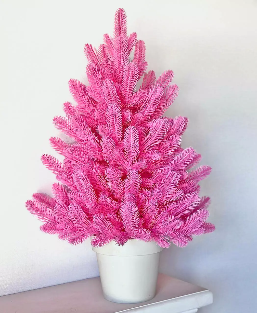 Ялинка встановлена в акуратний декоративний горщик нейтрального кольору, який підкреслює рожеву хвою та легко поєднується з різними інтерʼєрними стилями. Виріб виглядає охайно, естетично та стане яскравим акцентом святкового декору або оригінальним новорічним подарунком.