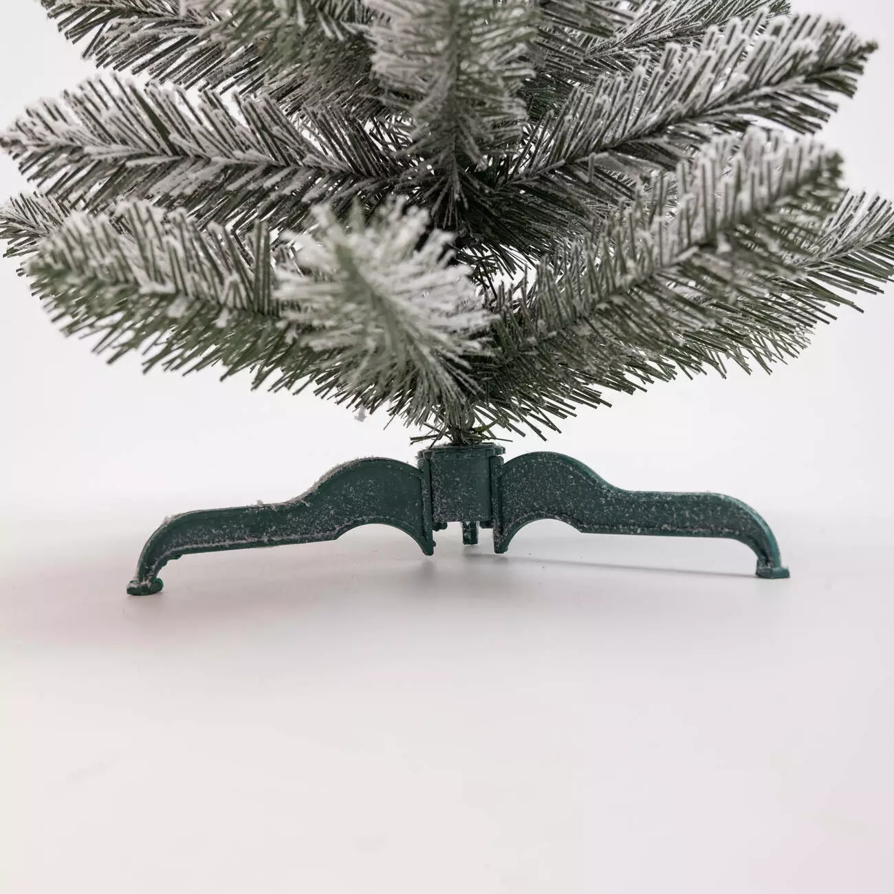 Гілки мають конічну форму, а зелені голочки довжиною до 2,5 см покриті м’яким штучним снігом, завдяки чому ялинка виглядає максимально природно, немов справжнє зимове деревце. Стовбур виготовлений із дроту, а пластикова опора додає стабільності та надійності конструкції.