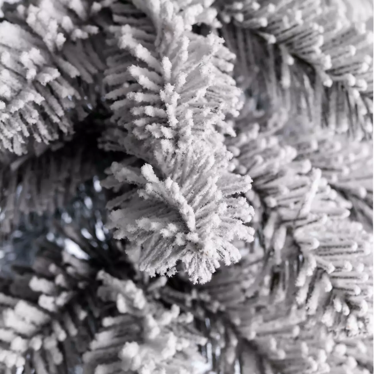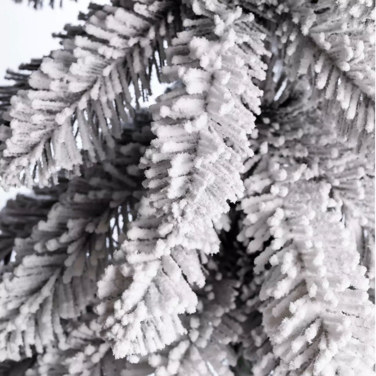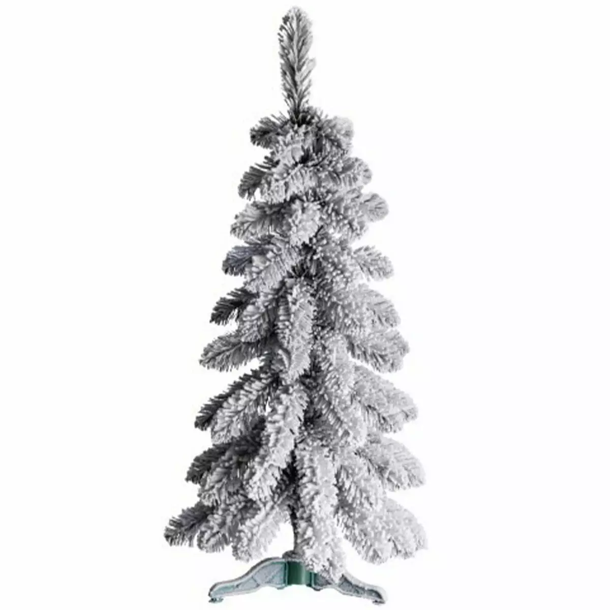 Гілки мають конічну форму, а зелені голочки довжиною до 3,5 см покриті м’яким штучним снігом і опущені вниз, завдяки чому ялинка виглядає природно, немов молода смерека, вкрита свіжим снігом. Стовбур виготовлений із дроту, а пластикова опора забезпечує стійкість конструкції та надійність використання.