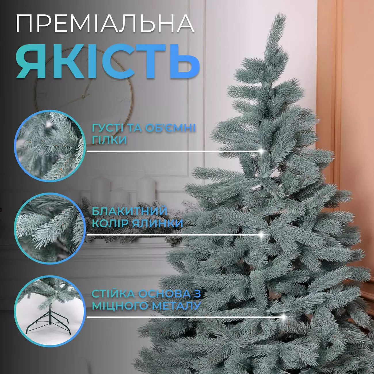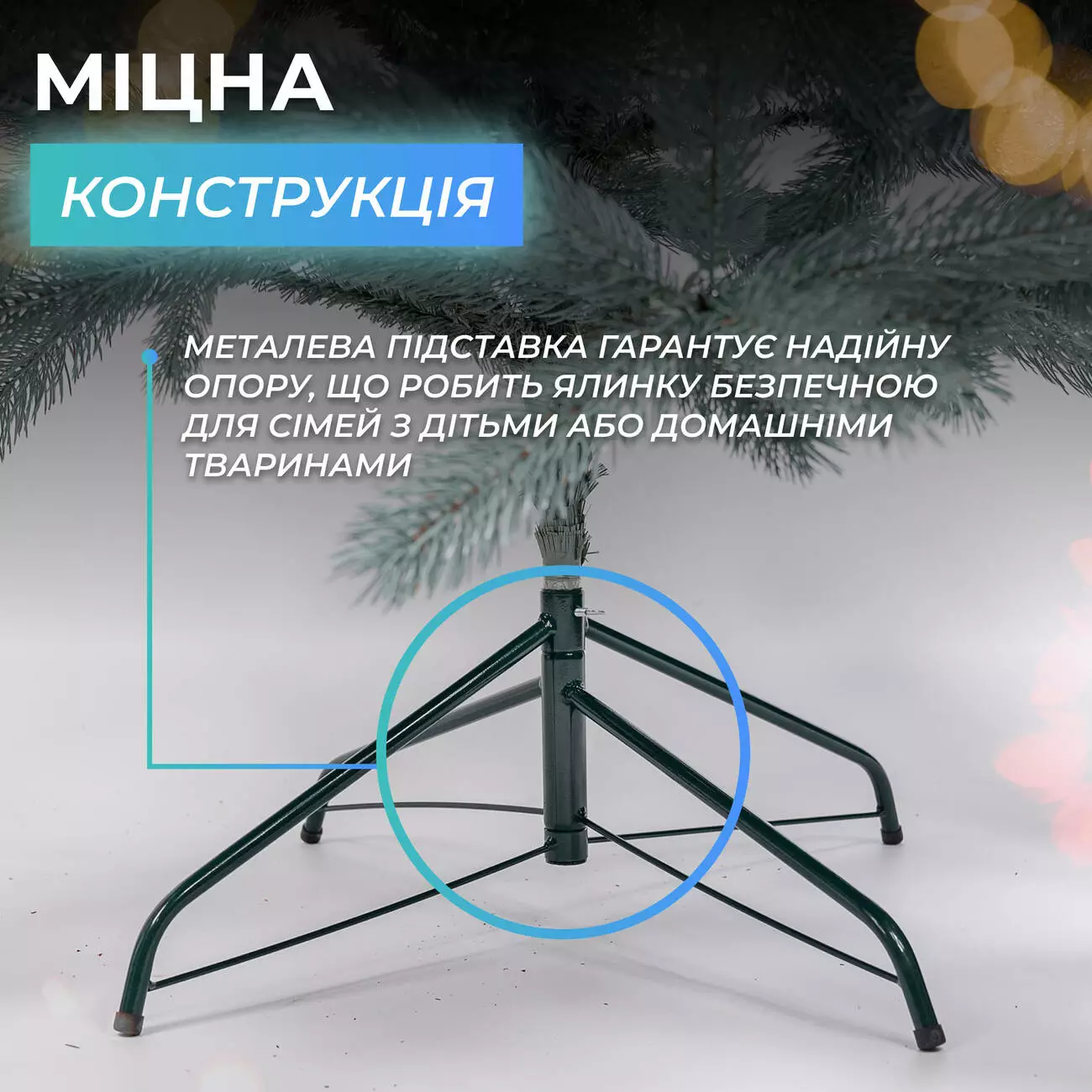 Ялинка виготовлена з високоякісного поліетилену ПЕ, що забезпечує її стійкість і довговічність. Міцна металева підставка надає стабільності та надійності, а легкість у складанні дозволяє швидко підготувати ялинку до свят. Це стильне і практичне дерево стане ідеальним доповненням до вашого новорічного декору.