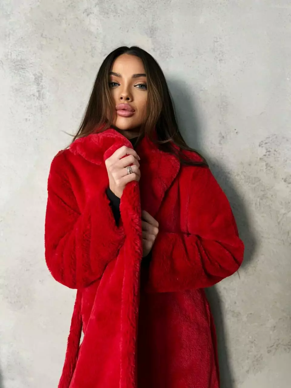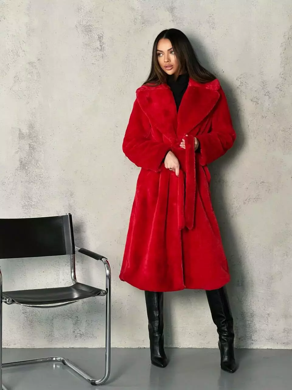 Тепла затишна шуба MIDI оснащена внутрішнім атласним підкладом і має дві кишені в бічних швах та одну внутрішню кишеню  Модель застібається поясом в тон