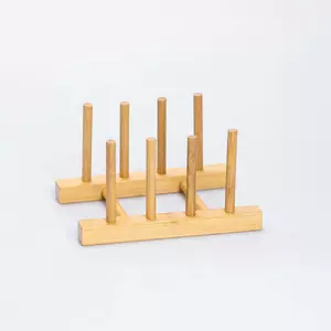 Підставка для тарілок з бамбука допоможе організувати простір на кухні, зберігаючи посуд у вертикальному положенні. Завдяки компактним розмірам вона не займає багато місця та підходить для розміщення на робочій поверхні чи в сушильній шафі. Конструкція складається з двох паралельних планок та рядів вертикальних стрижнів, між якими зручно ставити тарілки.