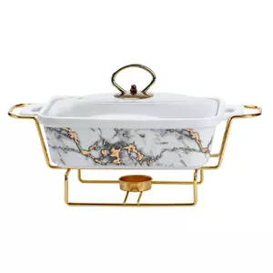 Золотиста металева підставка з підігрівом додає мармітниці особливого шарму та практичності. Підігрів забезпечує постійну підтримку теплої температури страв, що робить мармітницю ідеальною для довгих обідів або святкових заходів. Елегантний дизайн підставки підкреслює розкішний вигляд порцелянаової посудини та гармонійно доповнює загальний інтер'єр.