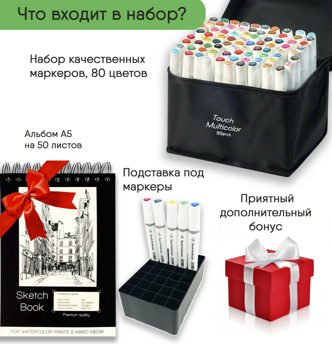 Вы покупаете Набор маркеров двусторонних Touch Multicolor 80 цветов и в подарок получаете Бумагу для скетчинга и рисования в формате А5.