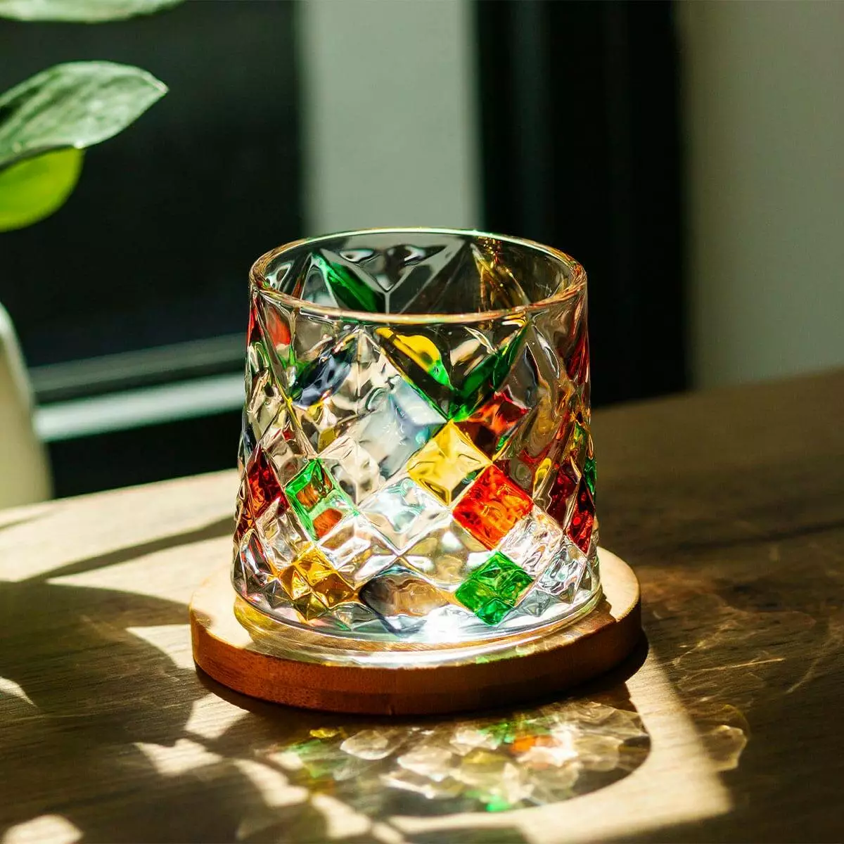 Подаруйте своїм напоям новий рівень розкоші з нашою склянкою-дзигою для віскі. Об'єм 300 мл і яскраве мультикольорове оформлення роблять її не лише функціональним, але й стильним аксесуаром для вашого бару. Склянка виготовлена з прозорого скла з фасетованою текстурою, яка відбиває світло, створюючи ефект мерехтіння і додаткову естетичну привабливість.