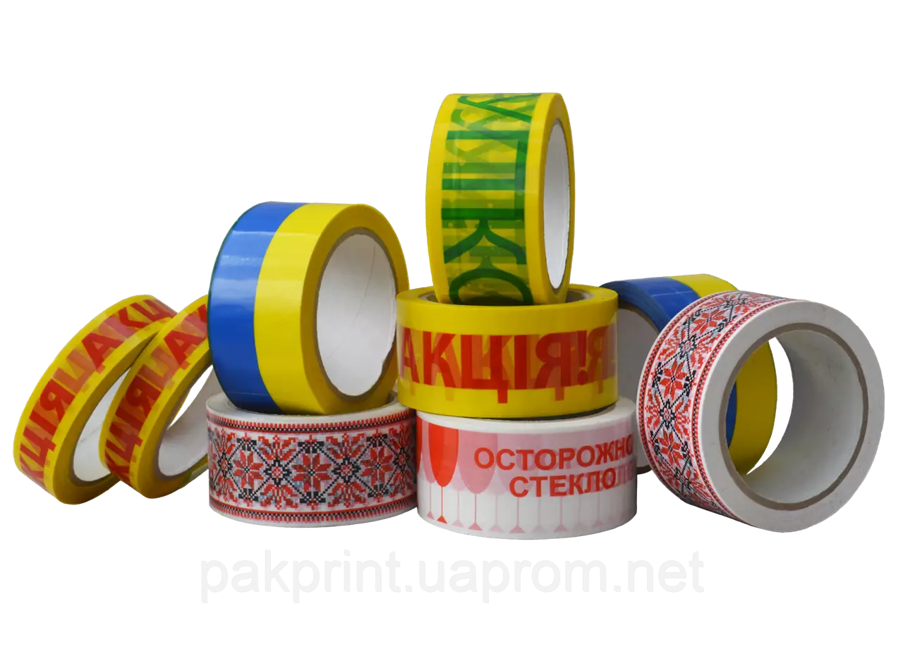 предлагает клейкую упаковочную ленту с надписью на двух языках (русском, украинском). Стандартная ширина ленты 48 мм, ширины 24 мм, 72 мм производиться по запросу клиента в кратчайшие сроки. В наличие клейкая лента с надписью «акция» на желтом или белом фоне. Скотч упаковочный всегда в свободном остатке на складе в стандартной намотке 66 м.