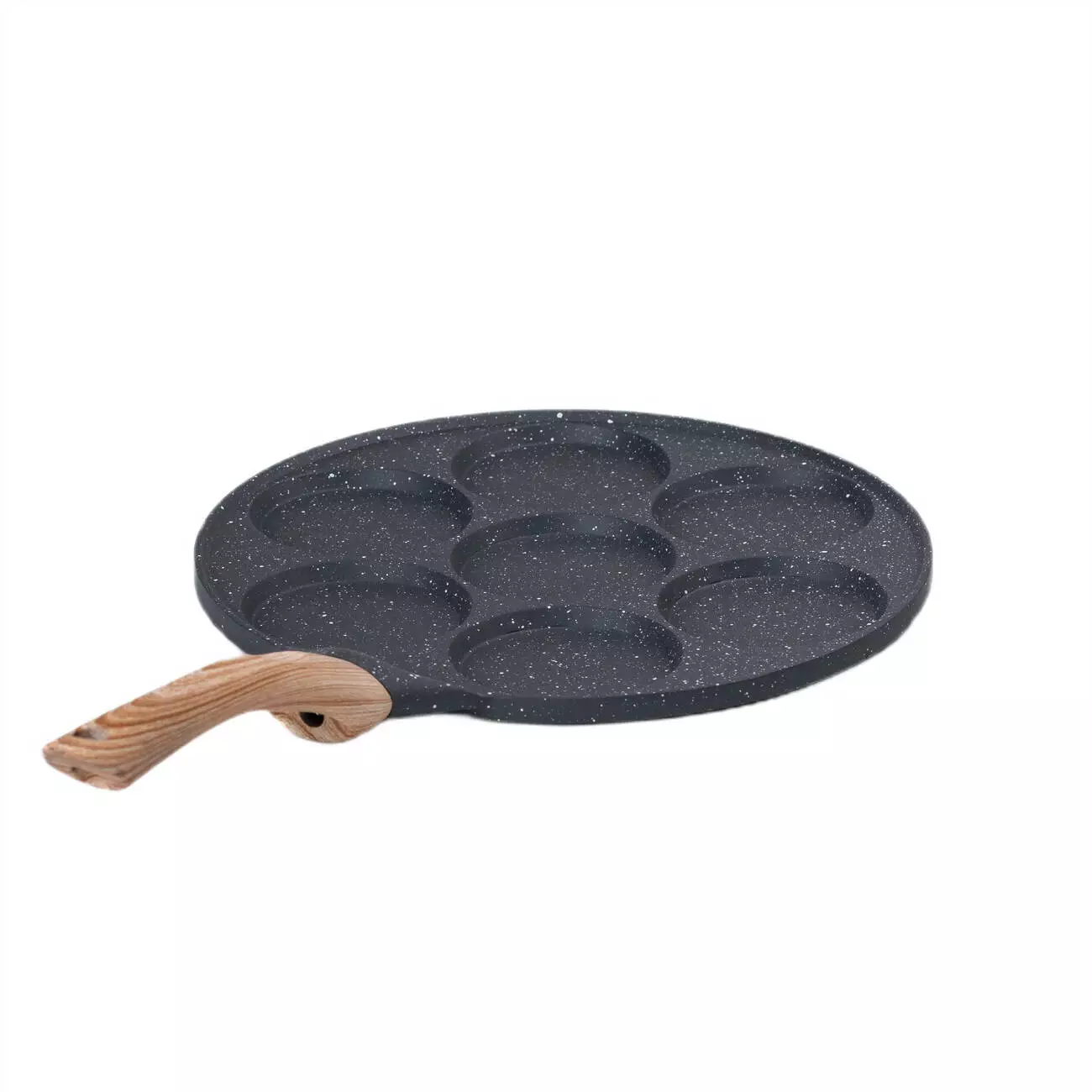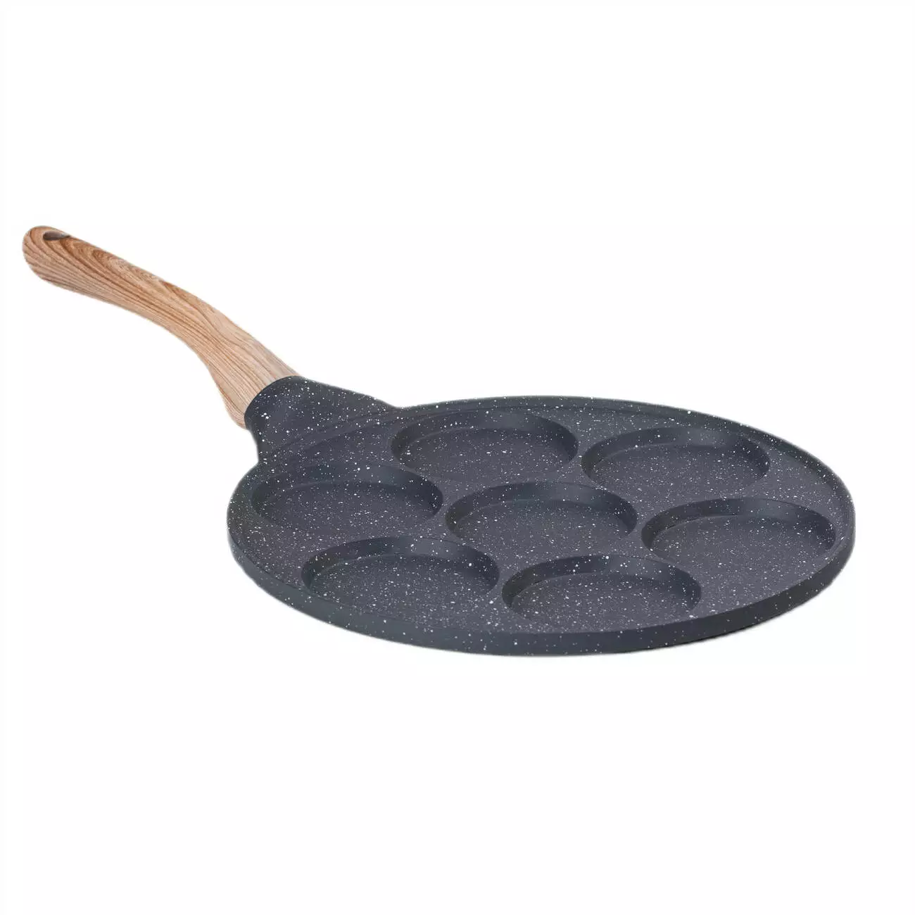 Сковорідка для панкейків з антипригарним покриттям — це ідеальний кухонний аксесуар для приготування рівномірних та смачних панкейків. Її діаметр становить 26 см, а об'єм однієї секції — 20 мл, що дозволяє готувати ідеальні порції. Корпус виготовлений з алюмінію, який відомий своєю легкістю і швидким нагріванням, а ручка з бакеліту надійно прикріплена шурупом, забезпечуючи безпеку та комфорт під час використання.