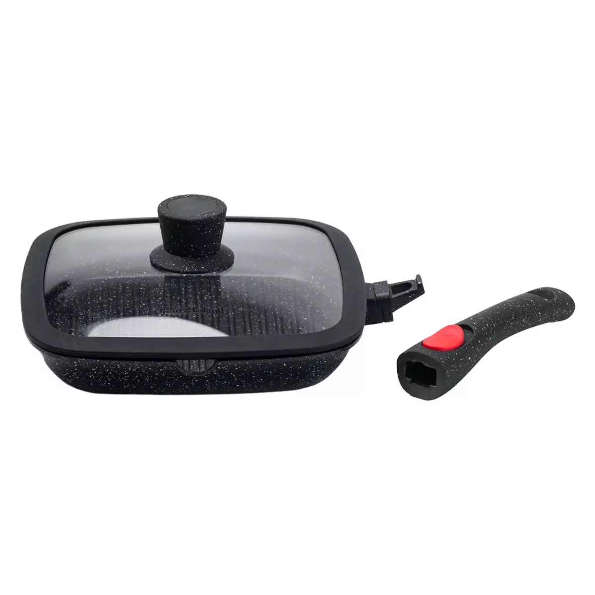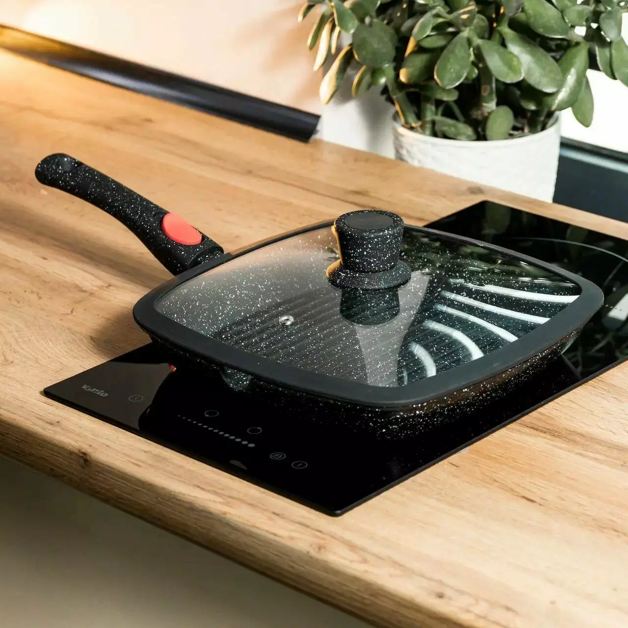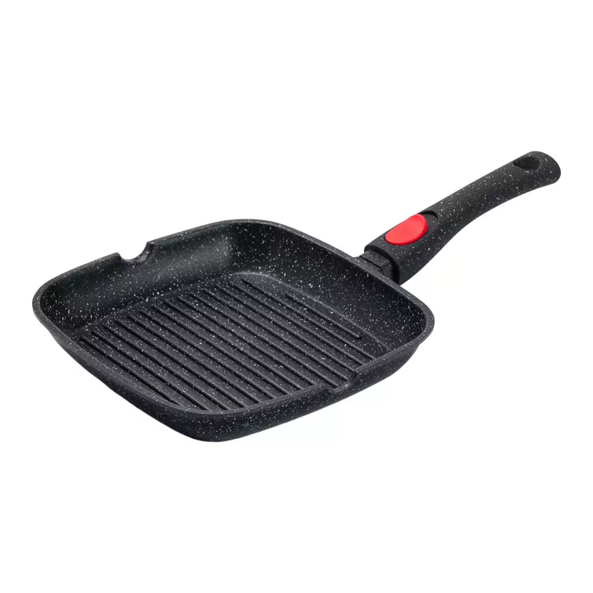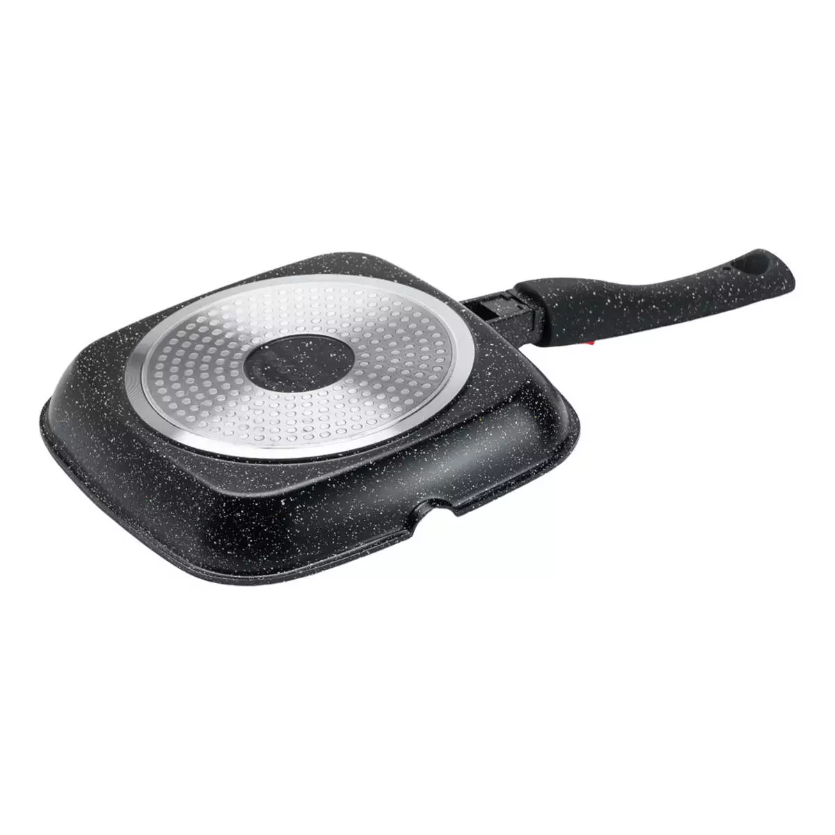 Ручка сковороди гриль не нагрівається, що забезпечує безпечне та зручне використання. Це ідеальний вибір для приготування різноманітних страв, від овочів до м'яса, з максимальним комфортом і ефективністю.