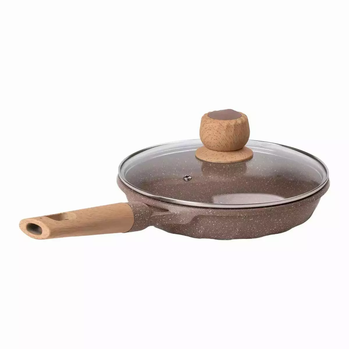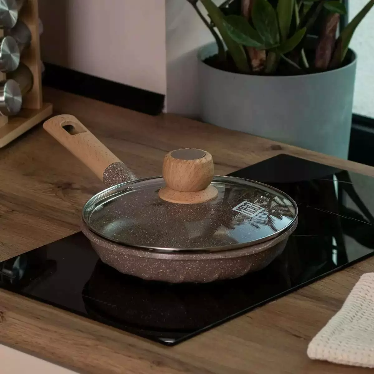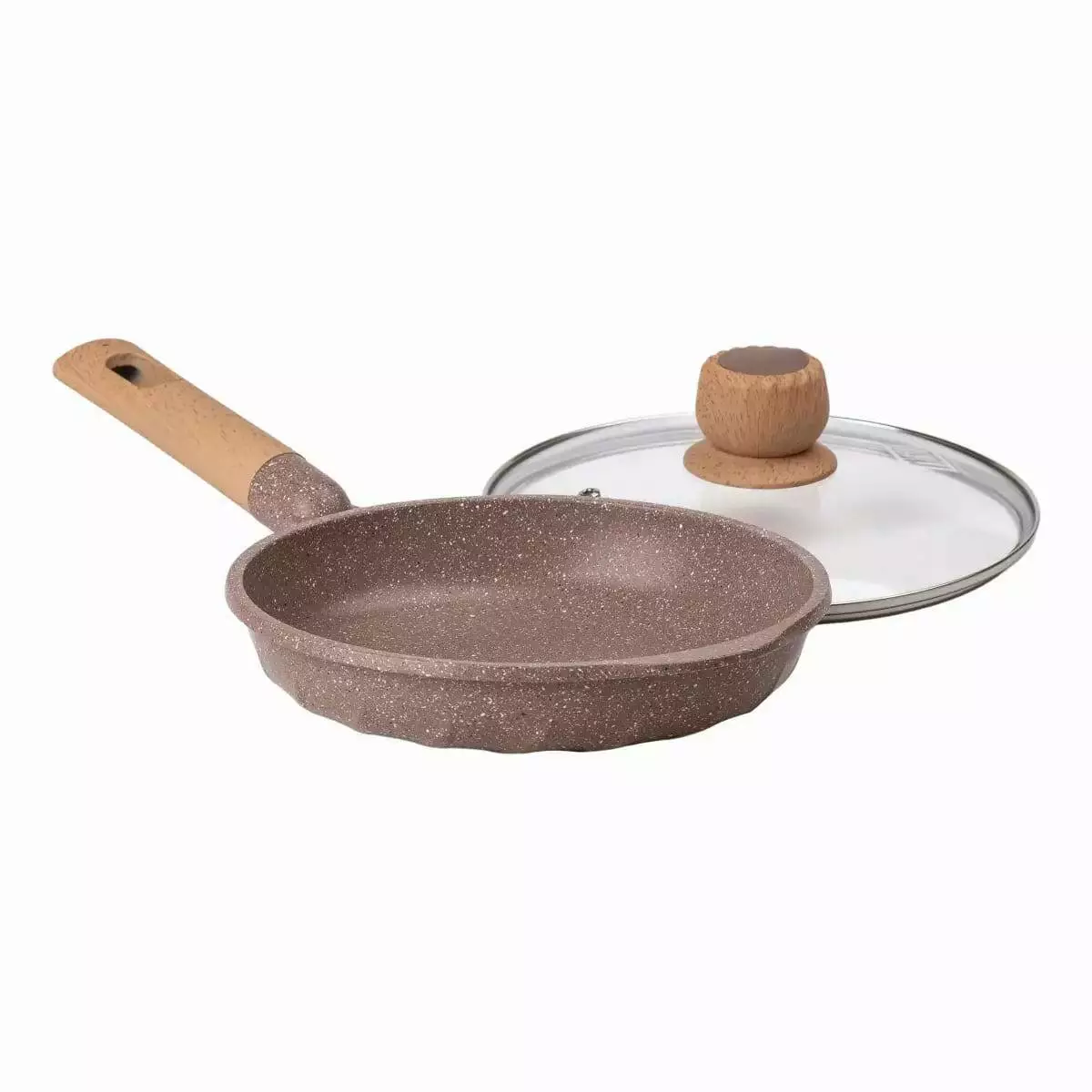 Сковорода має зручну ручку з бакеліту, який стійкий до високих температур і не нагрівається, що робить користування безпечним і комфортним. Скляна кришка із жароміцного скла дозволяє слідкувати за процесом приготування без необхідності її відкривати, зберігаючи тепло та аромат страви всередині.