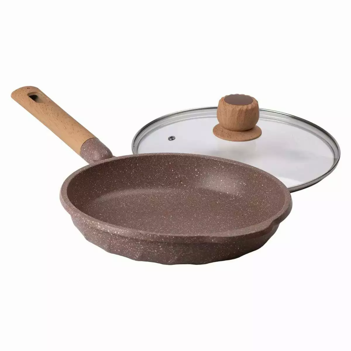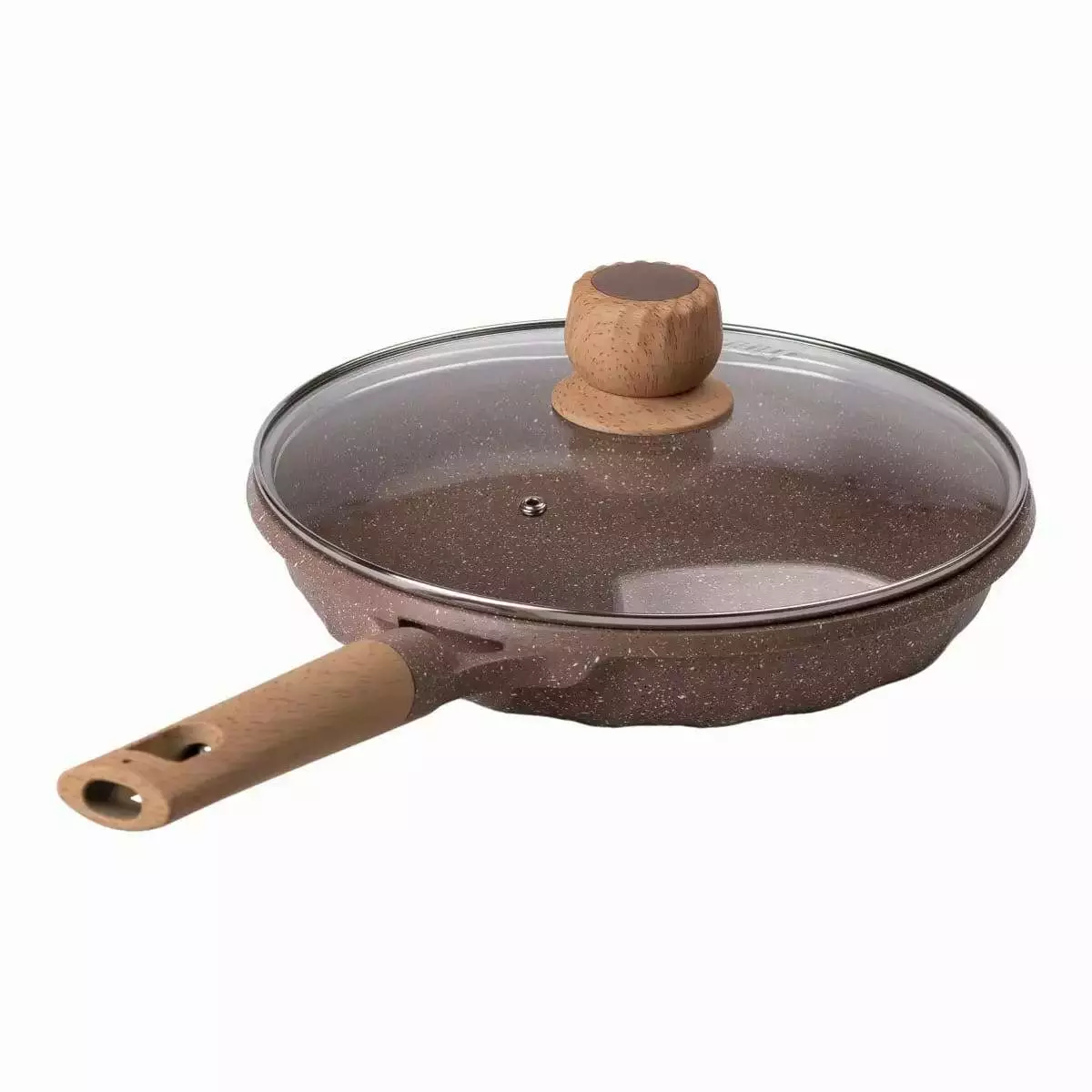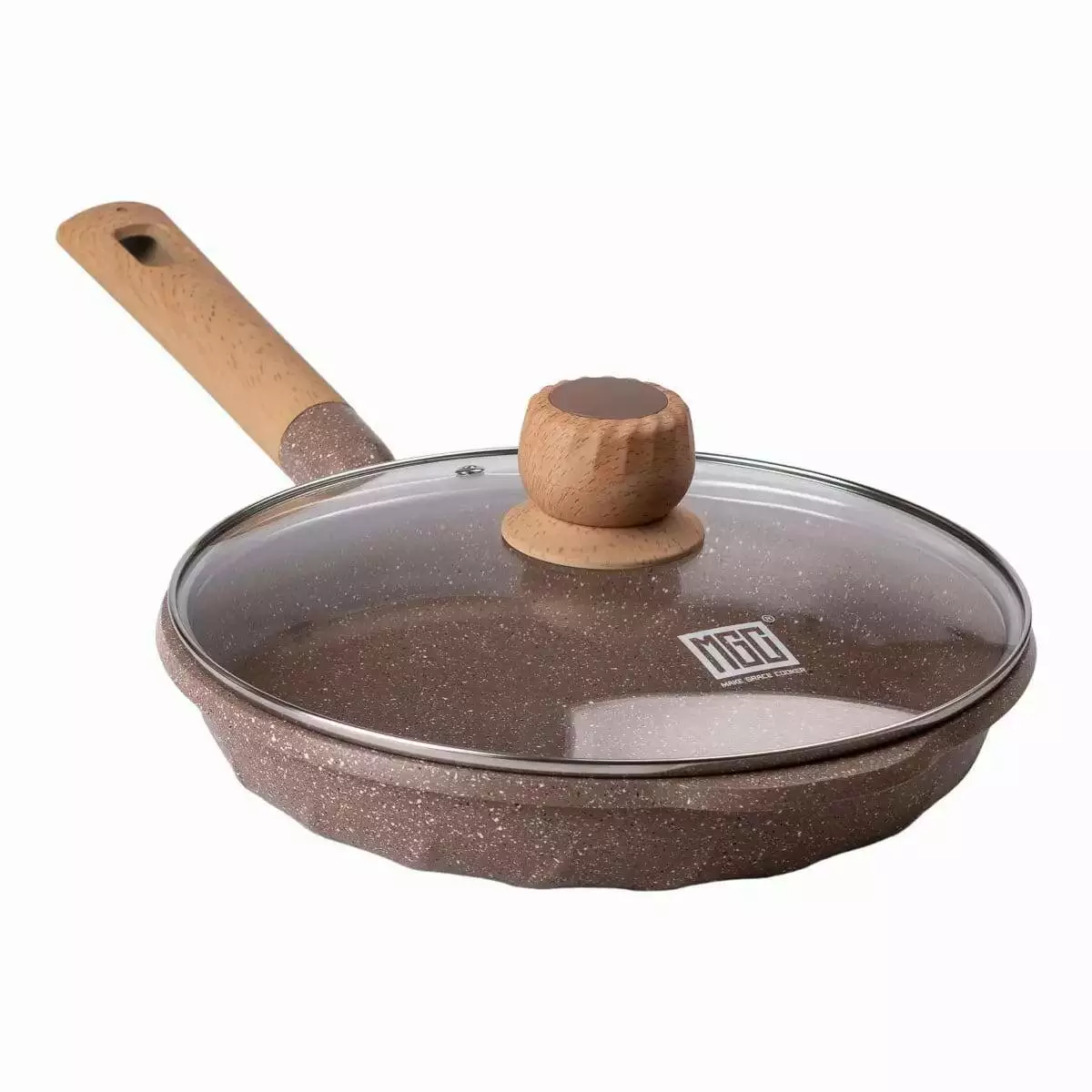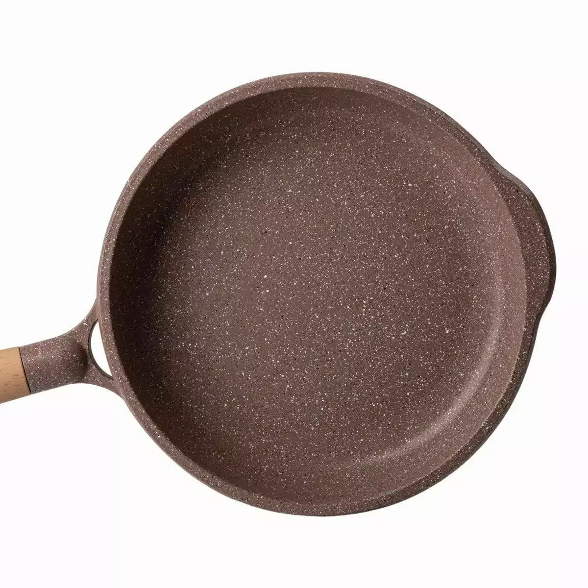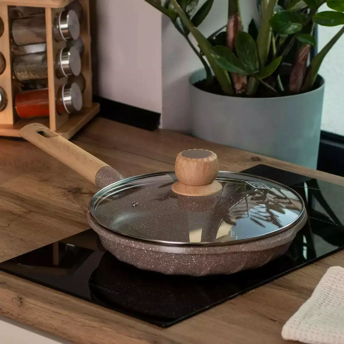 Зручна бакелітова ручка, стійка до нагрівання, робить користування безпечним, оскільки вона не нагрівається під час приготування. Кришка з жароміцного скла дозволяє легко контролювати процес приготування їжі, не втрачаючи тепло та аромат. Завдяки товстому дну в 5,5 мм, сковорода рівномірно розподіляє тепло і зберігає його, що забезпечує високу ефективність приготування.