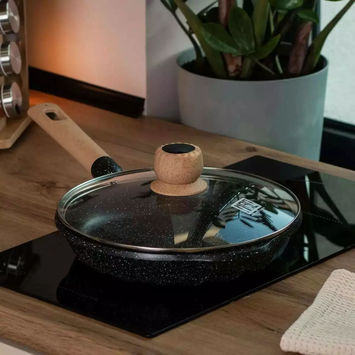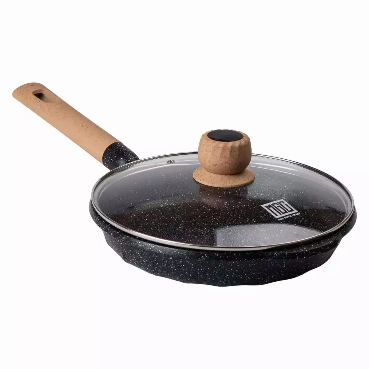 Зручна бакелітова ручка, стійка до нагрівання, робить користування безпечним, оскільки вона не нагрівається під час приготування. Кришка з жароміцного скла дозволяє легко контролювати процес приготування їжі, не втрачаючи тепло та аромат. Завдяки товстому дну в 5,5 мм, сковорода рівномірно розподіляє тепло і зберігає його, що забезпечує високу ефективність приготування.
