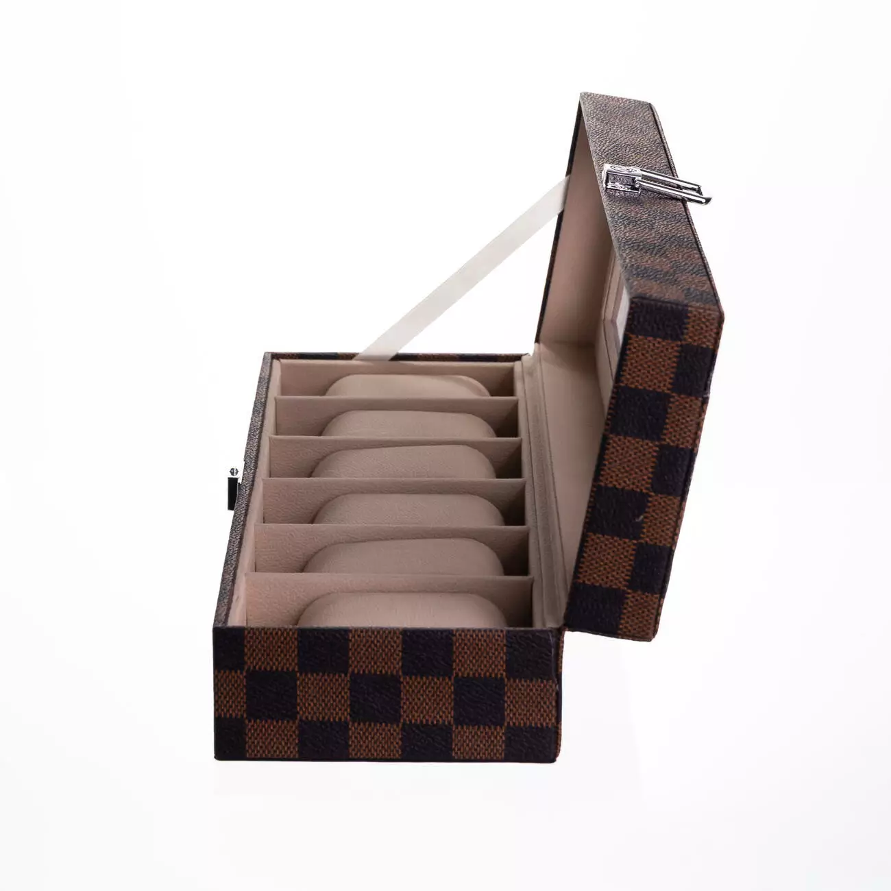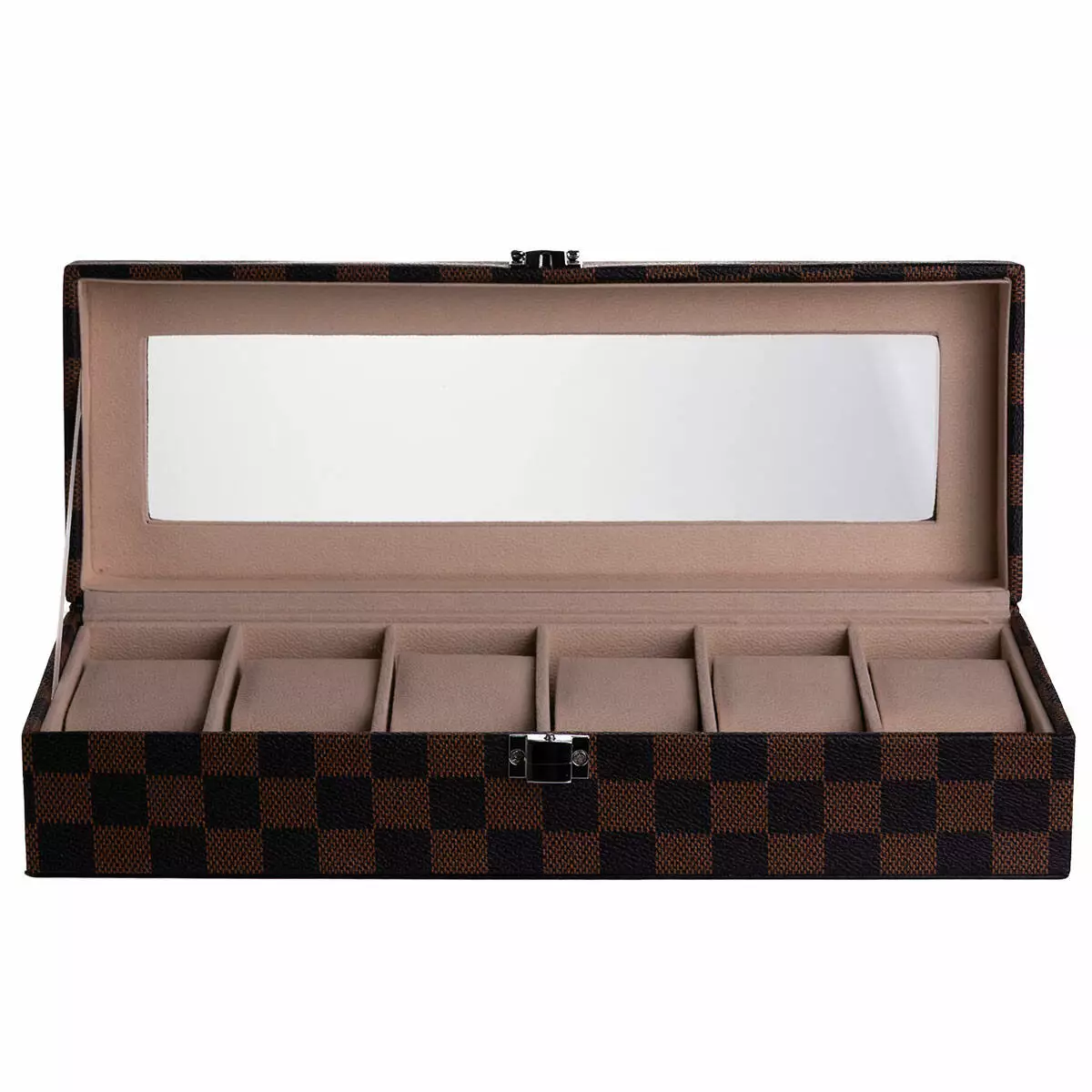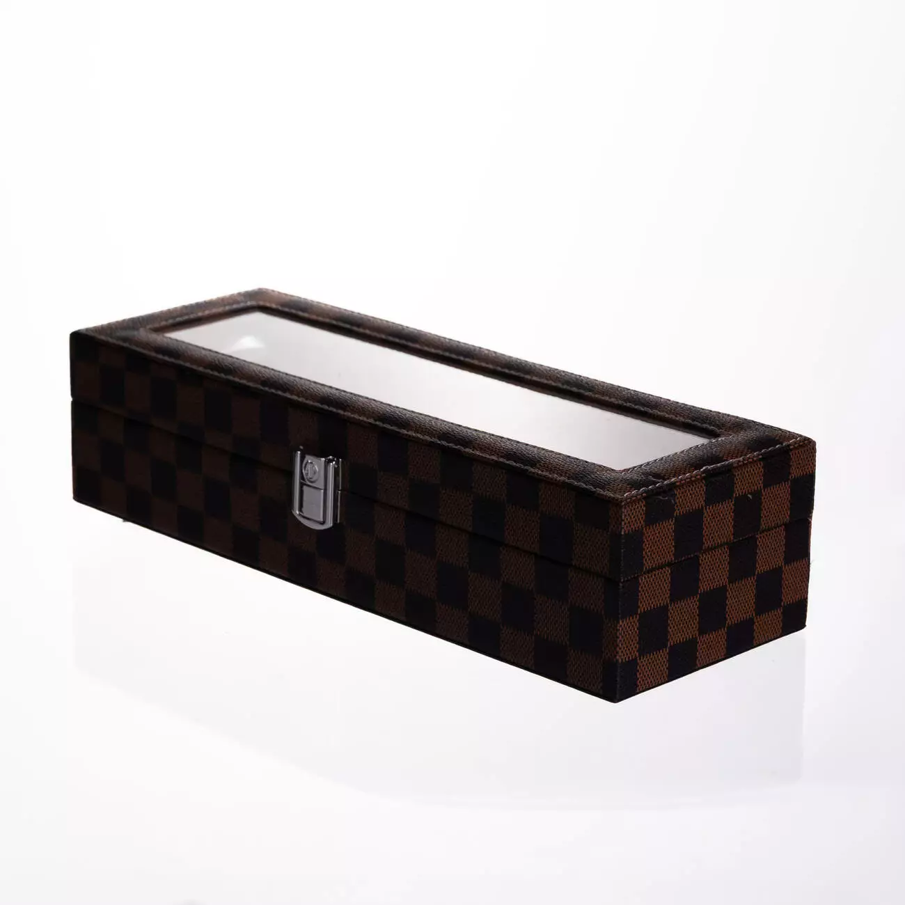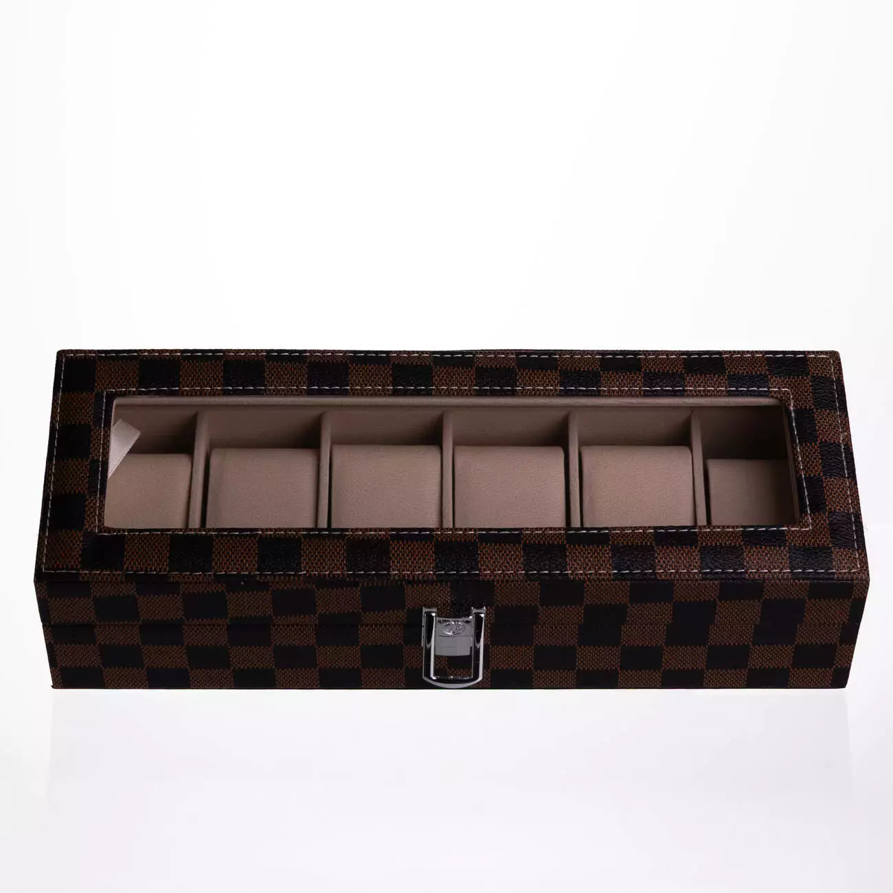 Модель розрахована на шість годинників і оснащена металевою защіпкою для надійної фіксації кришки. Зовнішня поверхня виконана з екошкіри з класичним шаховим візерунком, що надає виробу акуратного та впорядкованого вигляду. Матеріал простий у догляді та підходить для щоденного використання.