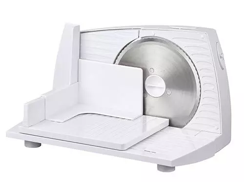 Компактний, безпечний, складаний слайсер. Зі знімним пушером. Міцний пластик, з якого він виготовлений, полегшує транспортування. Високоякісне 170-міліметрове лезо з нержавіючої сталі дозволяє нарізати холодне м'ясо на тонкі скибочки і нарізати собі міцний шматочок сільського хліба. Товщину нарізки можна легко регулювати. Ціле можна легко розібрати на елементи, що полегшує очищення. Займає дуже мало місця. Завдяки можливості складання, після розрізання його можна прибрати назад у шафу. Кнопка безпеки захищає від випадкового включення. Пластикова опорна пластина також призначена для захисту ваших пальців від травм. Гумові ніжки запобігають рух слайсера.