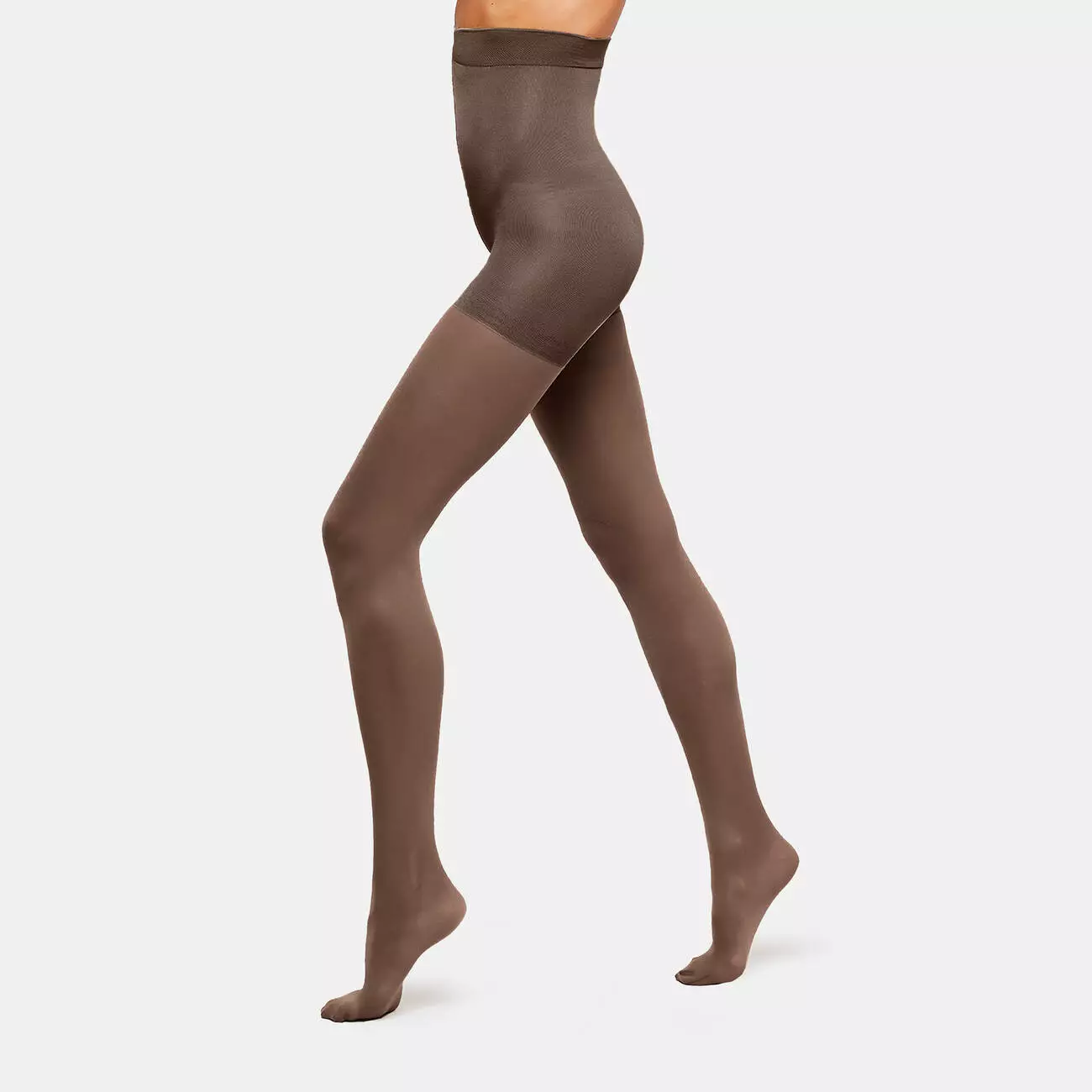 Тонкі жіночі колготки 20 DEN з високими шортиками 150 DEN забезпечують ефект підтягування та моделювання фігури. Щільні коригуючі зони формують стегна, талію та живіт. Гладка матова текстура комфортно облягає ноги. Широка еластична резинка, пласкі шви та бавовняна ластовиця гарантують зручність у щоденному носінні.