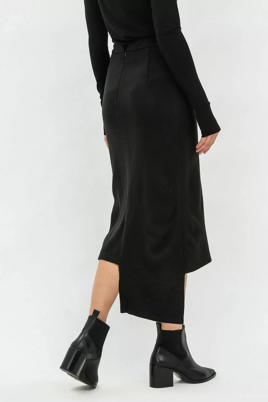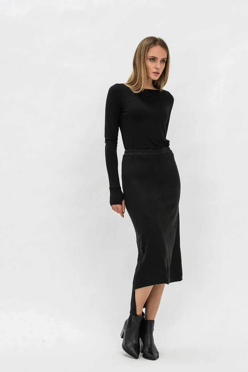 Трикотажна модна спідниця міді з асиметричним низом стане
