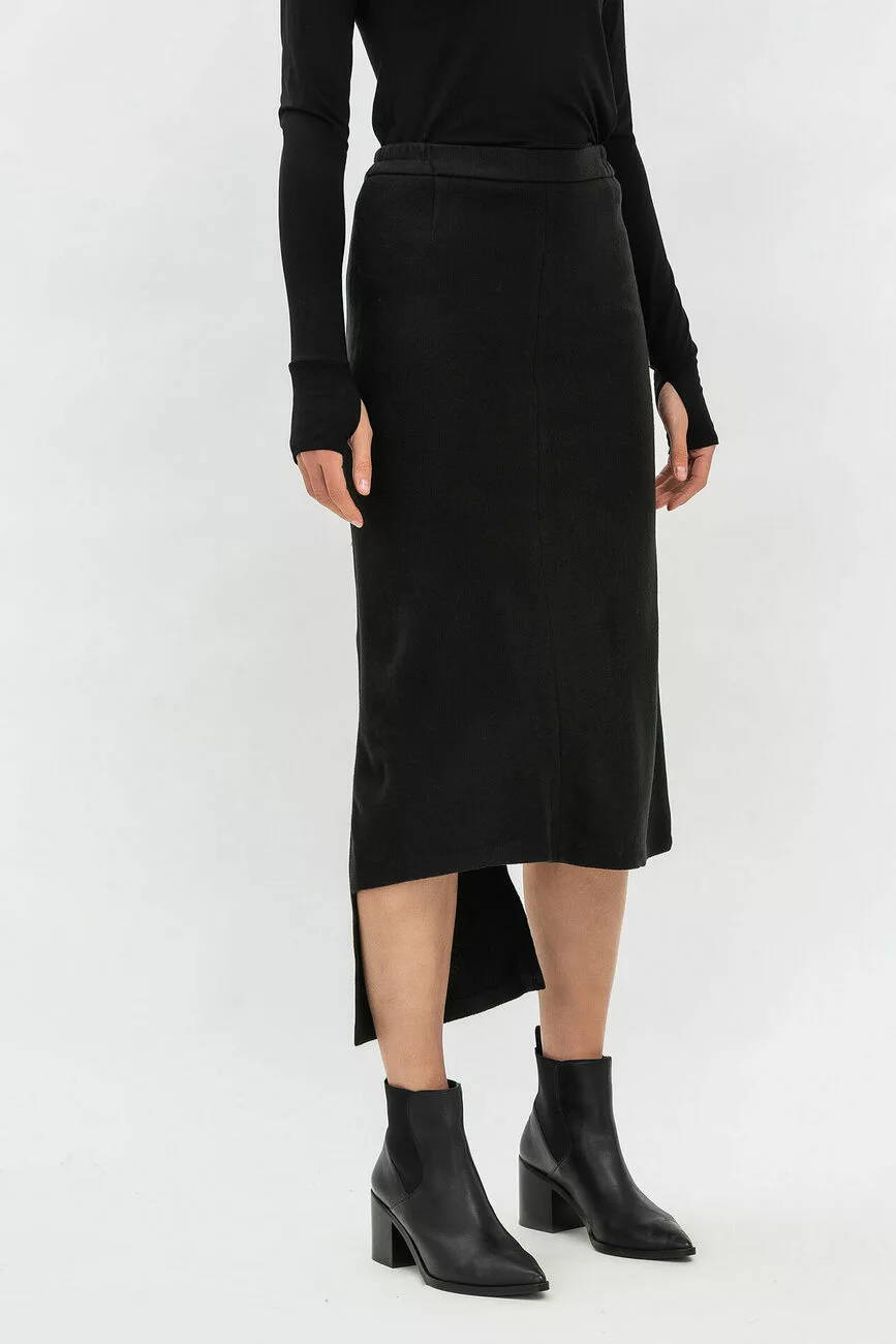 Трикотажна модна спідниця міді з асиметричним низом стане