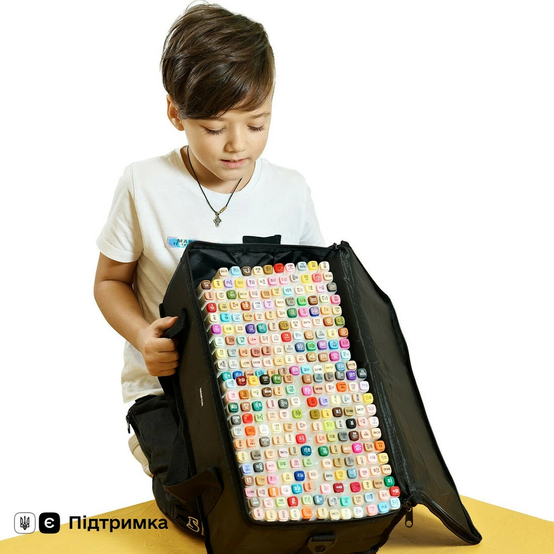 В наборе 200 маркеров разных цветов. Корпус пластиковый, гладкий.